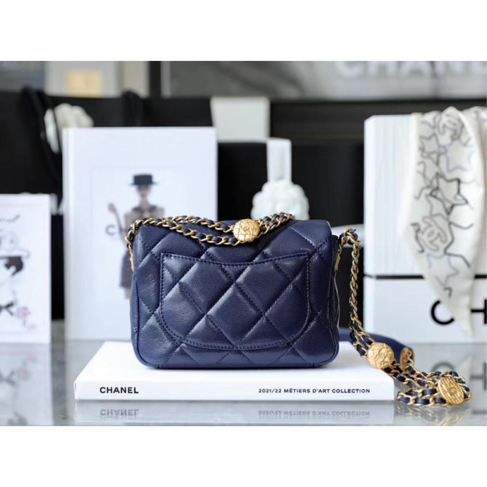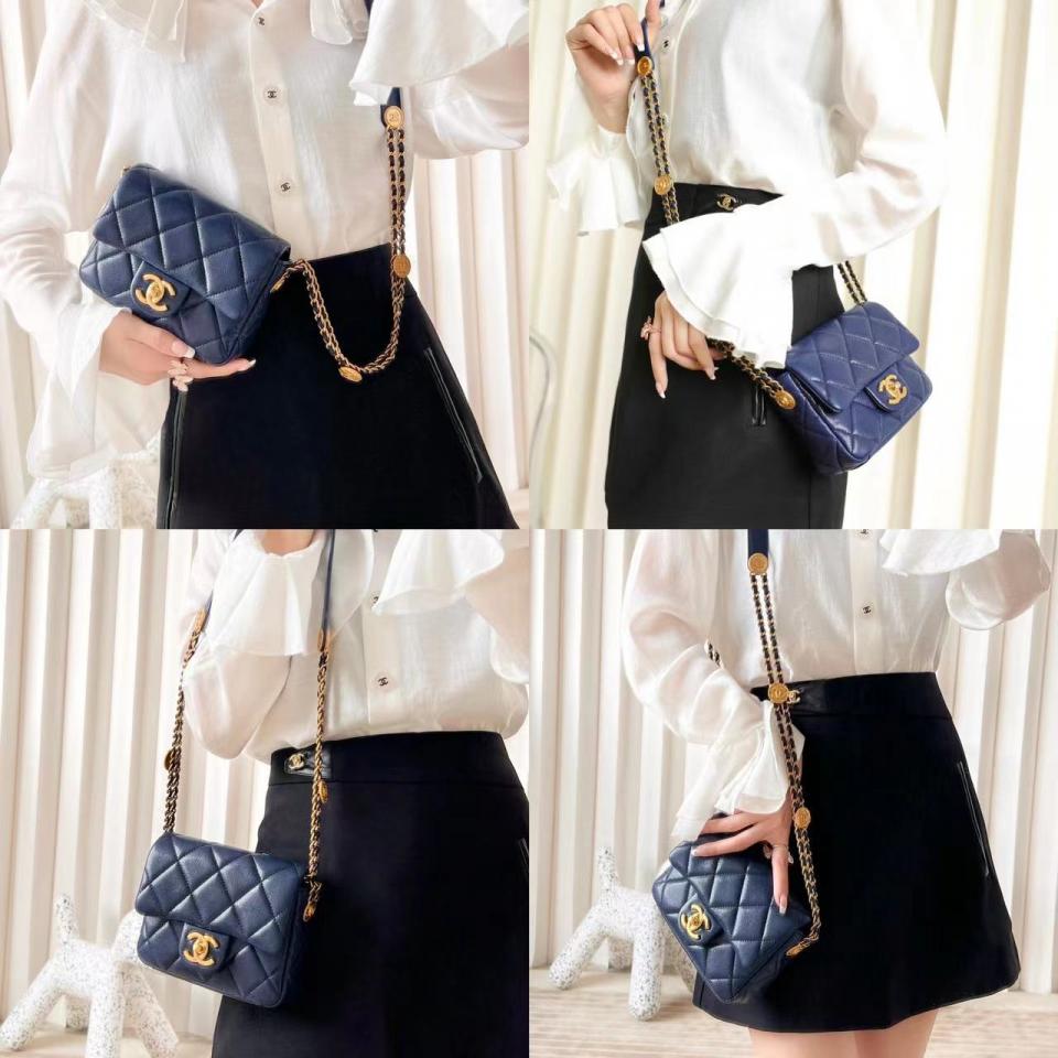 2022春夏新品 高級手工坊 徽章金幣鏈條口蓋包(海軍藍18cm) 金幣鏈條非常重工精緻