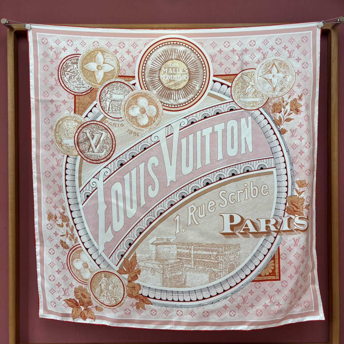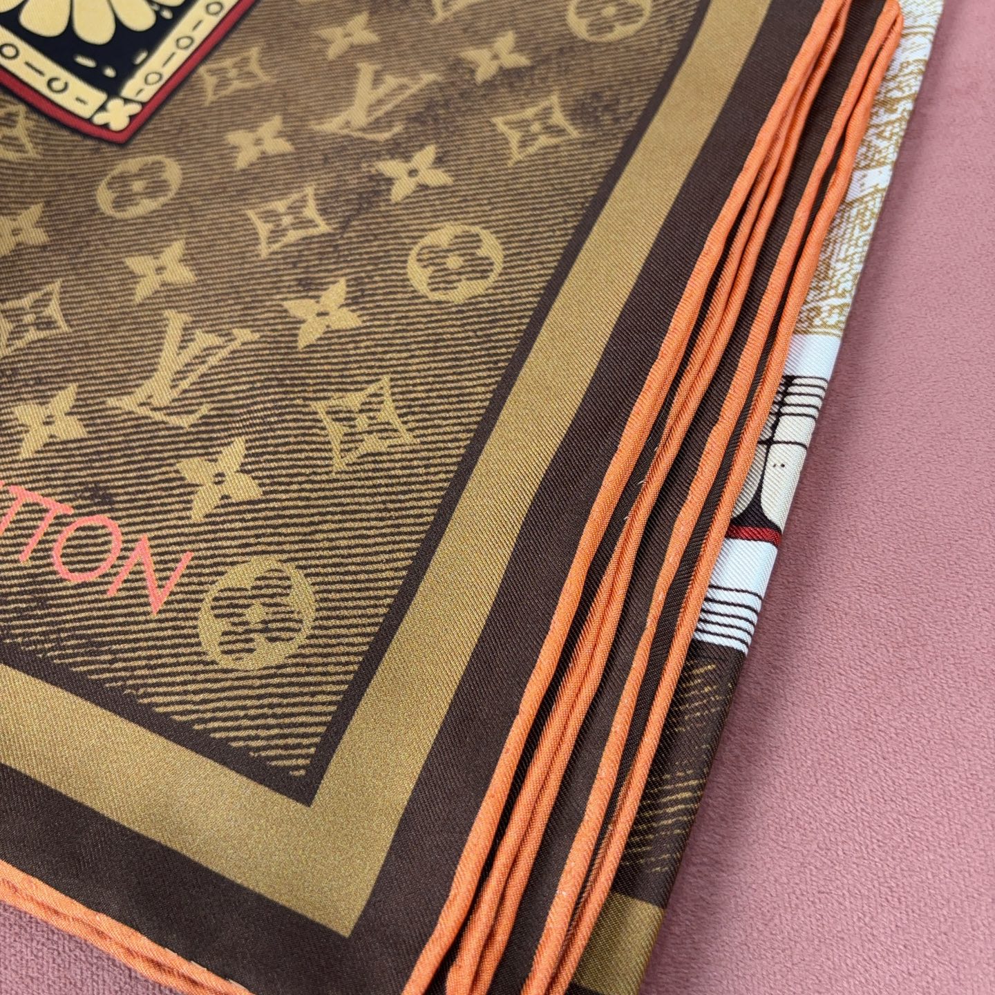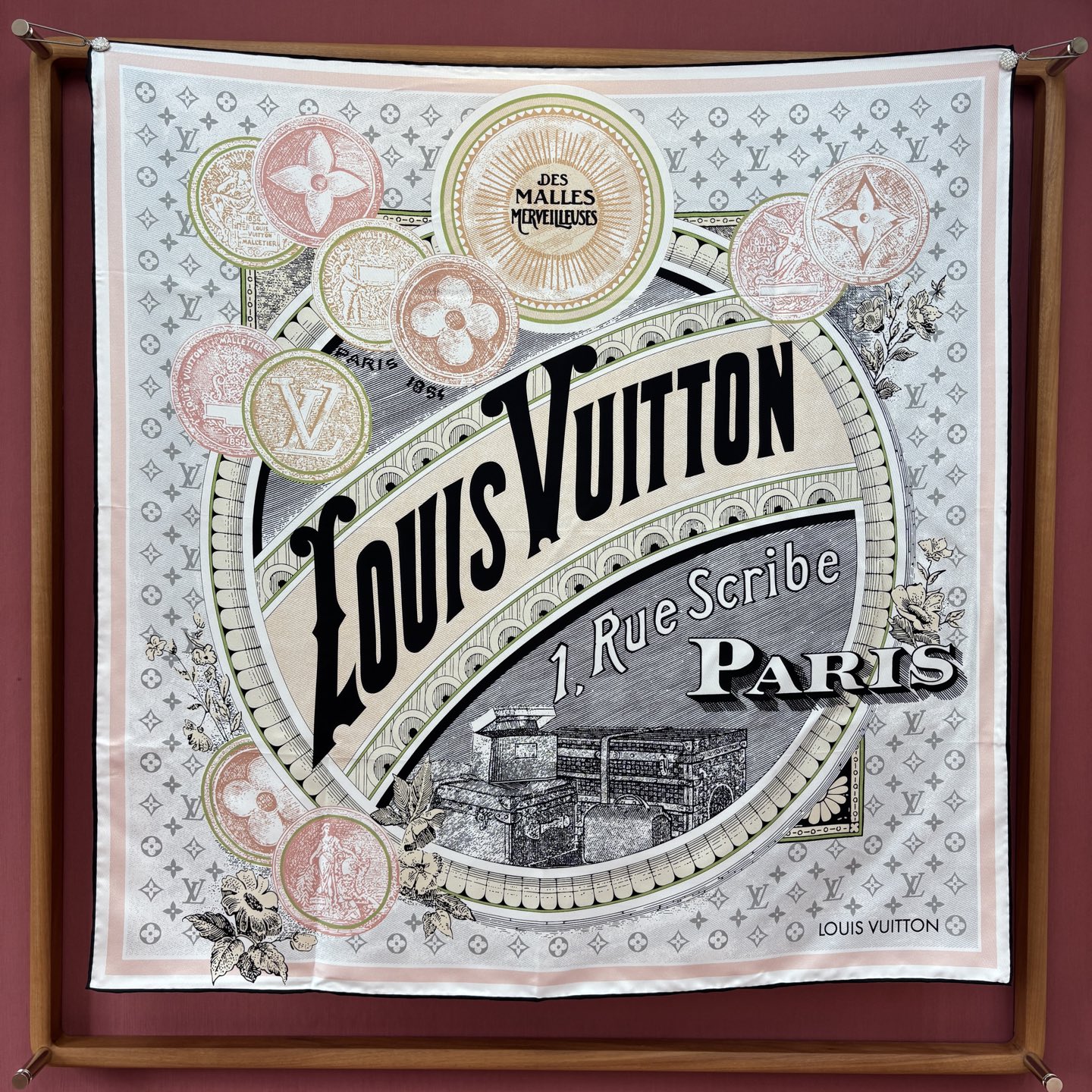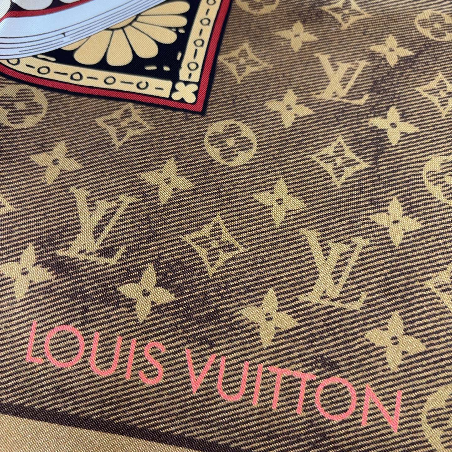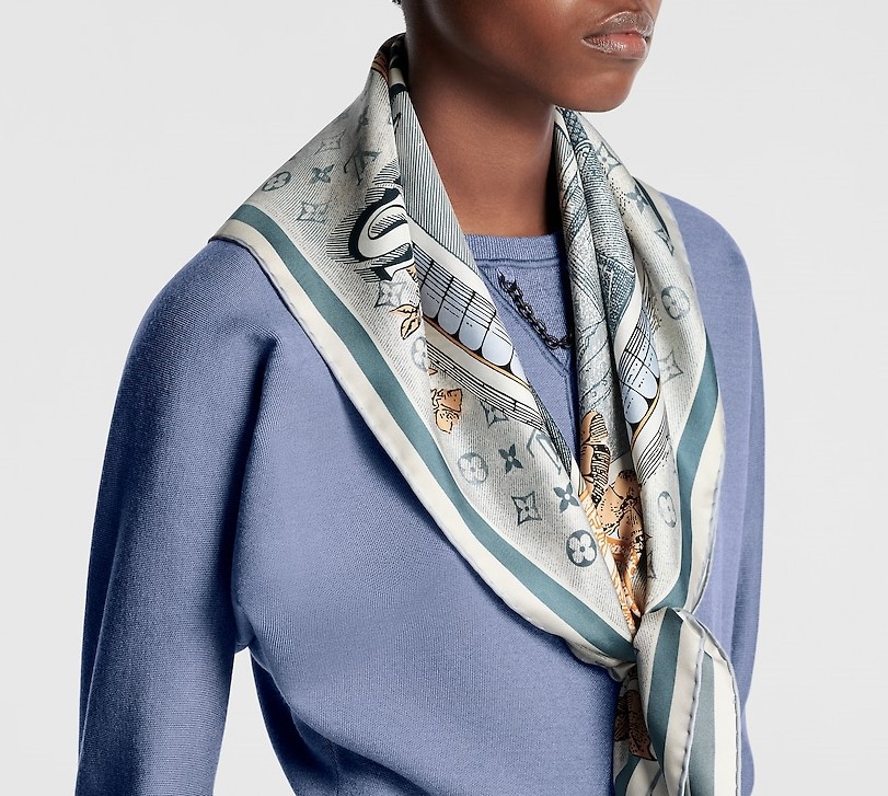 這款方巾靈感取自 19 世紀末的廣告海報設計,結合LV經典Monogram背景與繽紛的行李箱圖騰、旅行貼紙元素,彷彿一秒穿越回最初的輝煌年代。