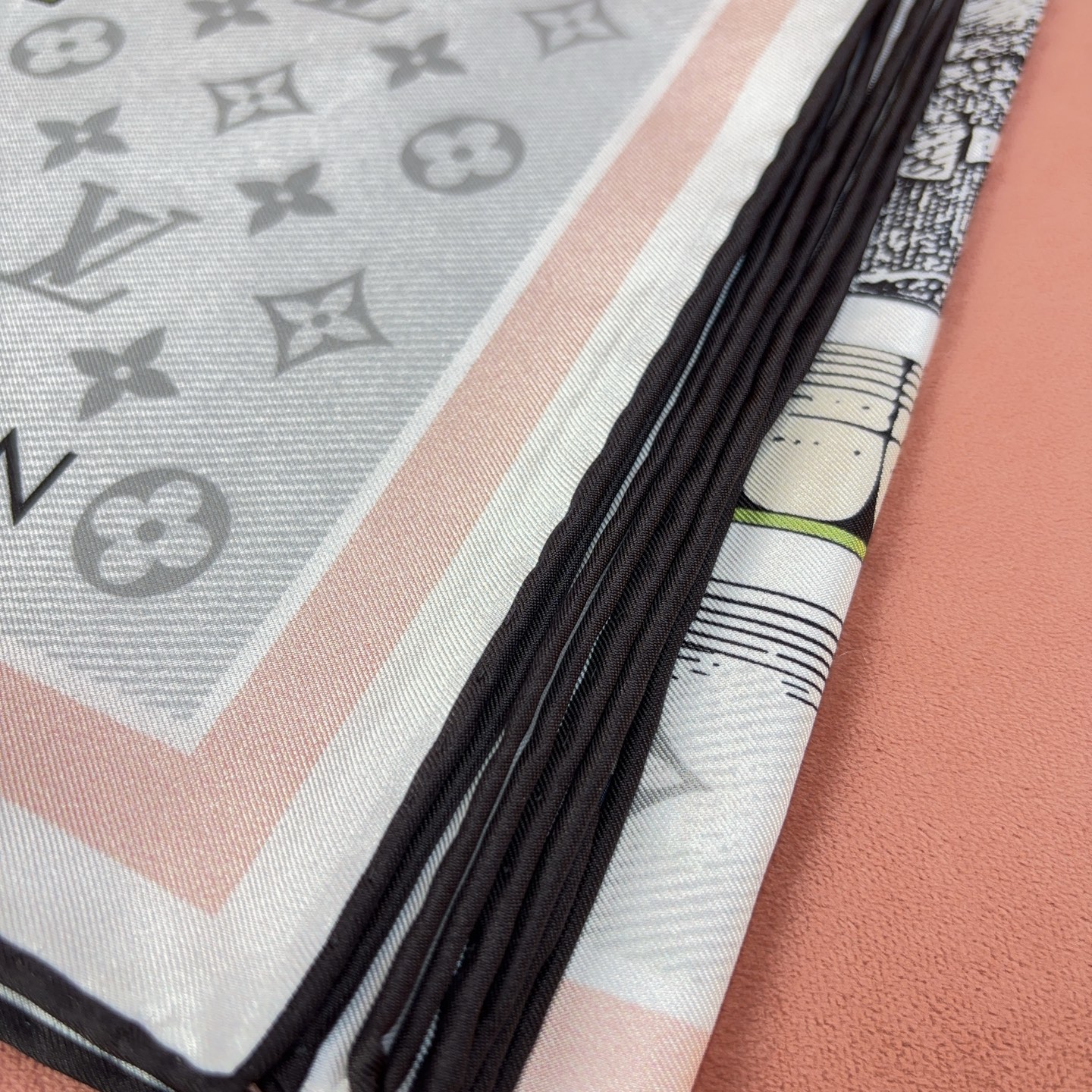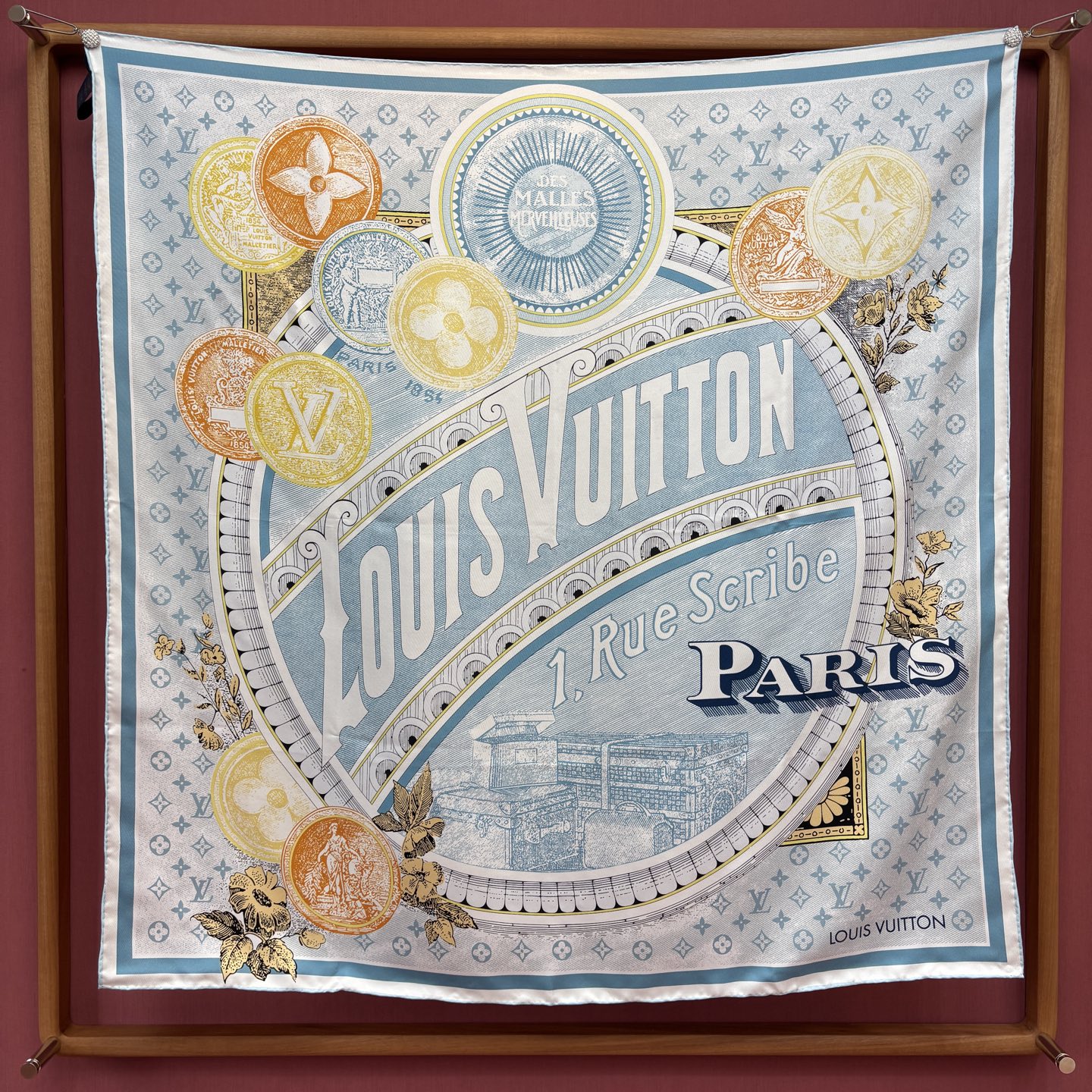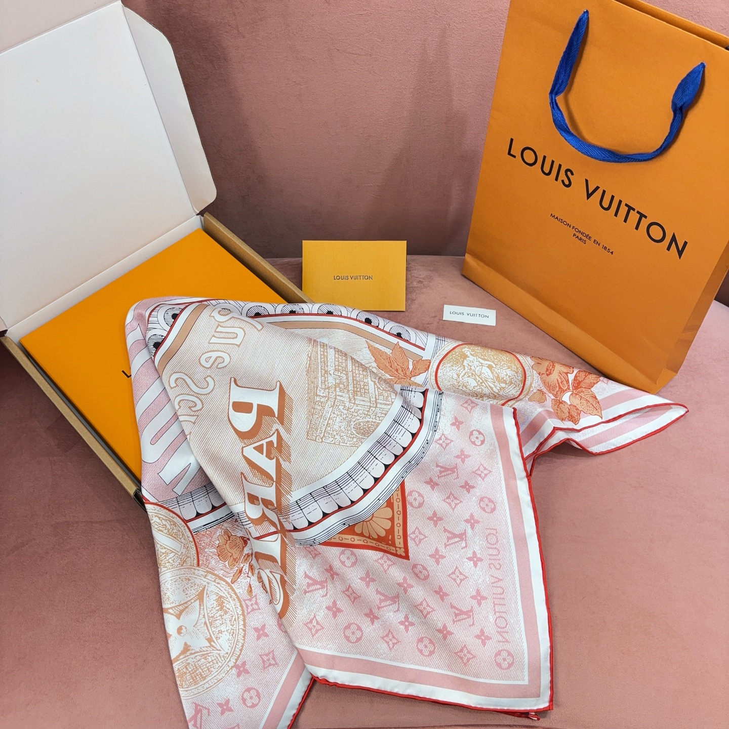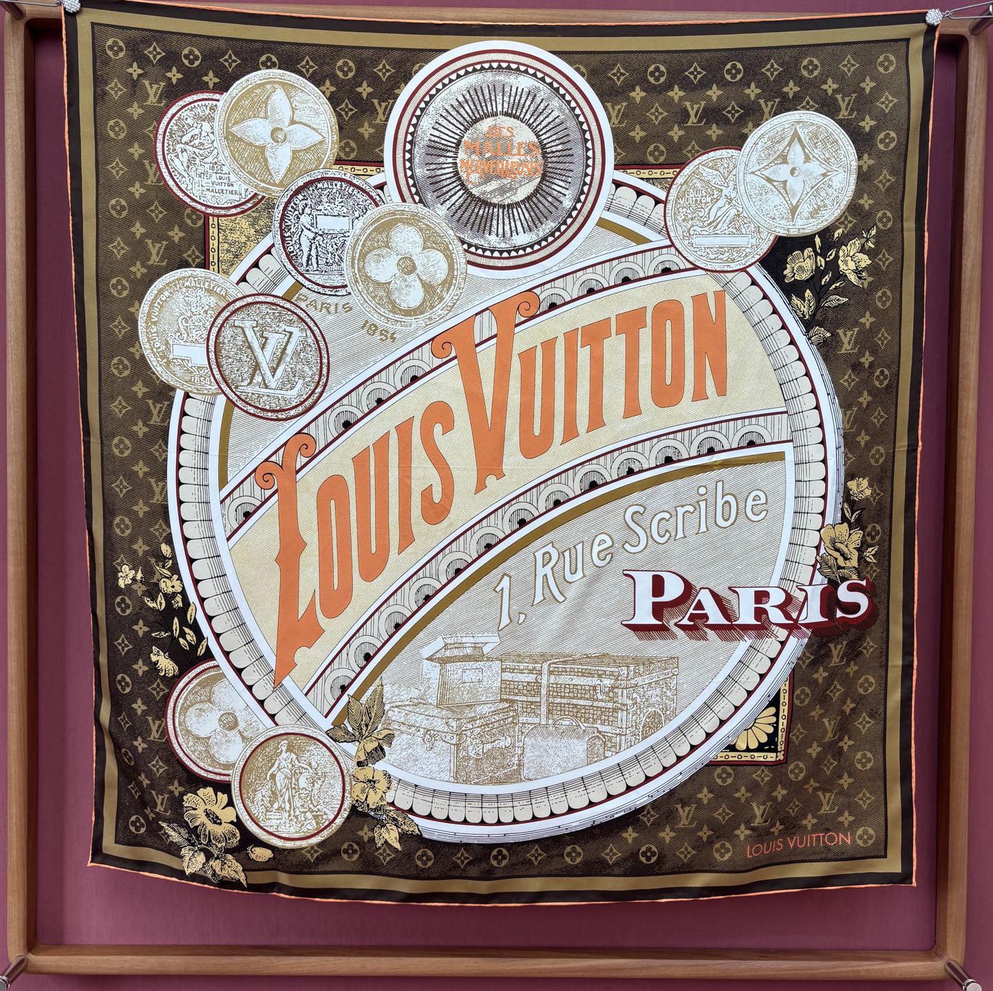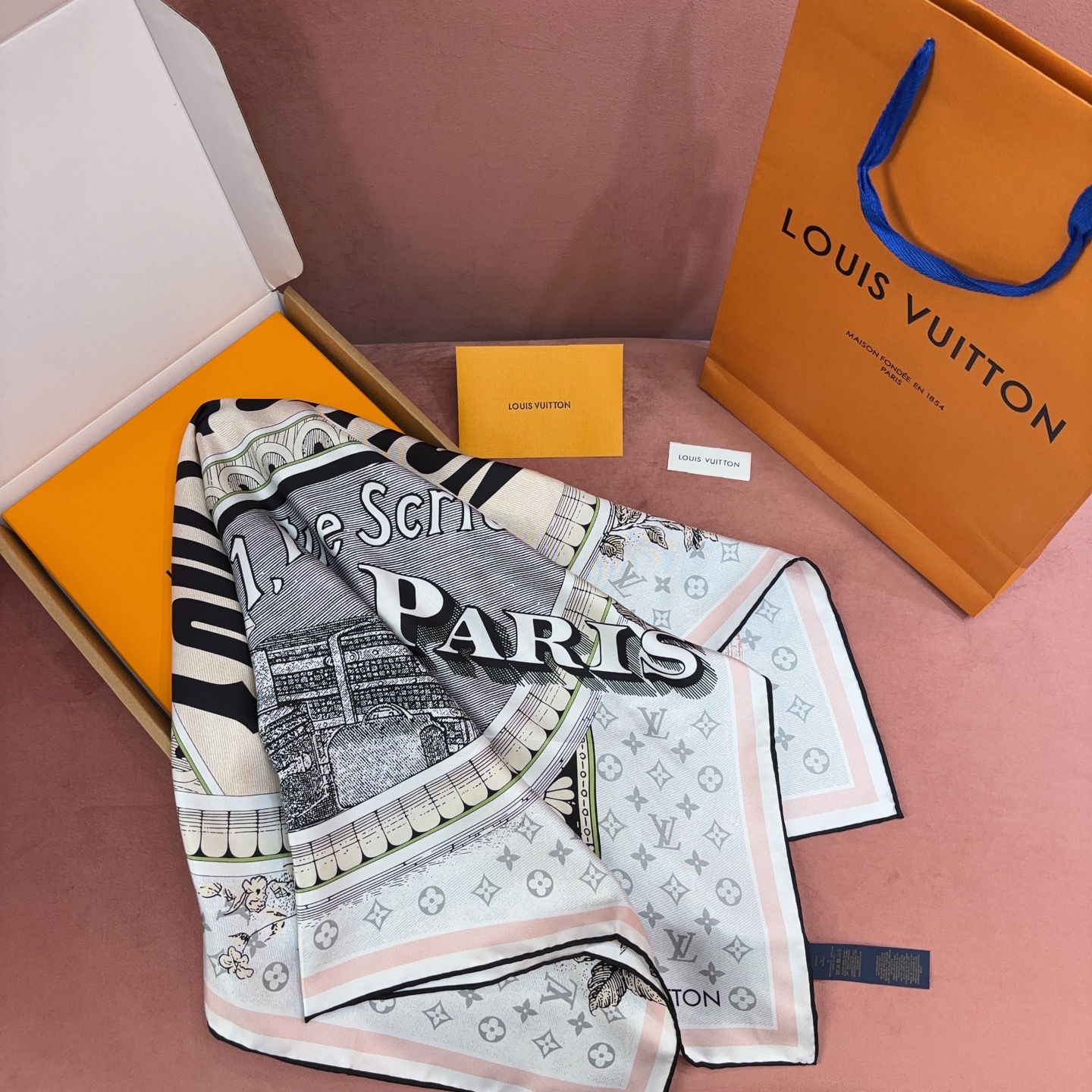 這款方巾靈感取自 19 世紀末的廣告海報設計,結合LV經典Monogram背景與繽紛的行李箱圖騰、旅行貼紙元素,彷彿一秒穿越回最初的輝煌年代。
