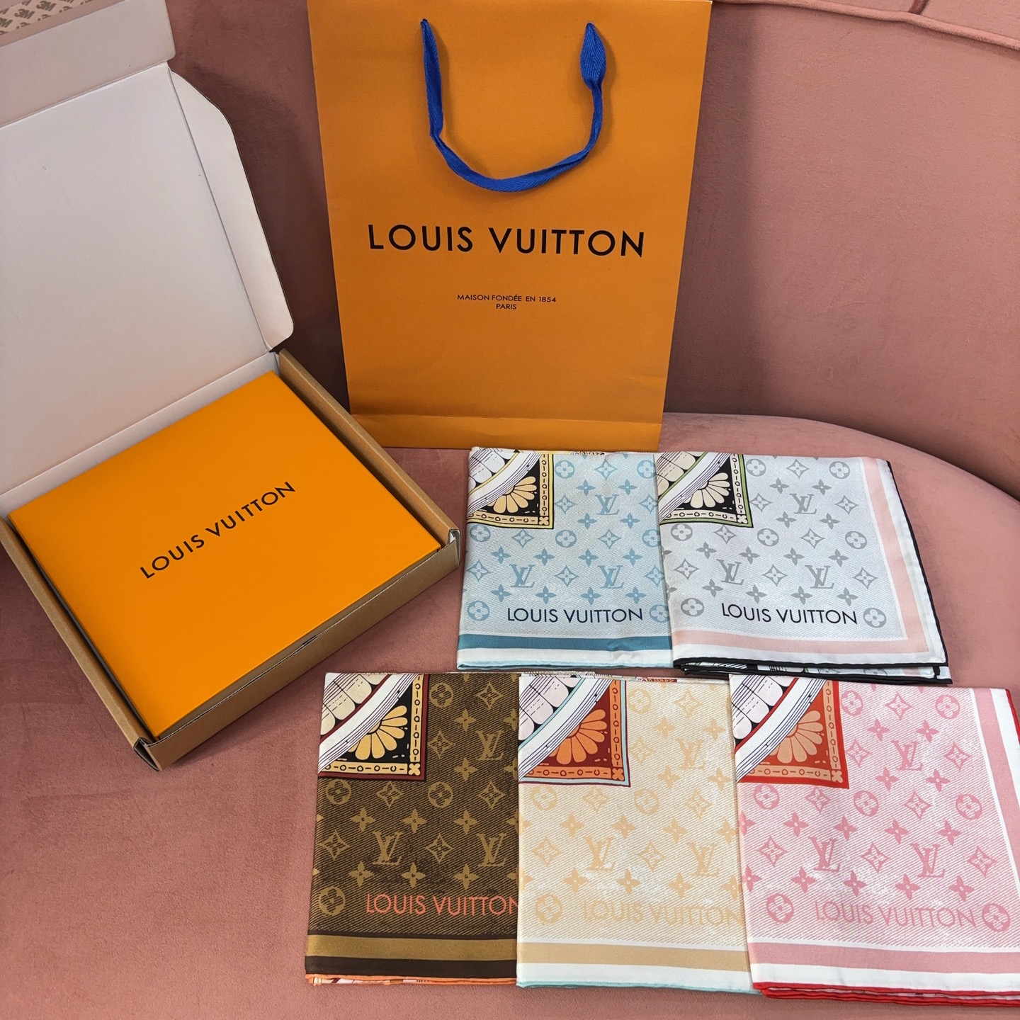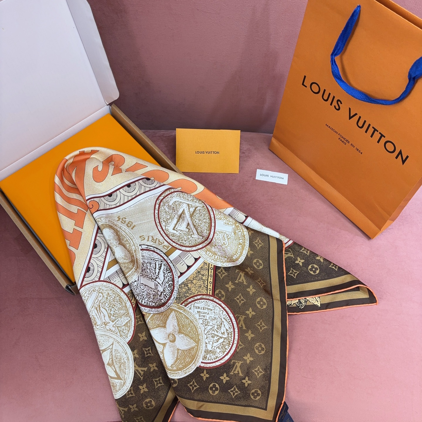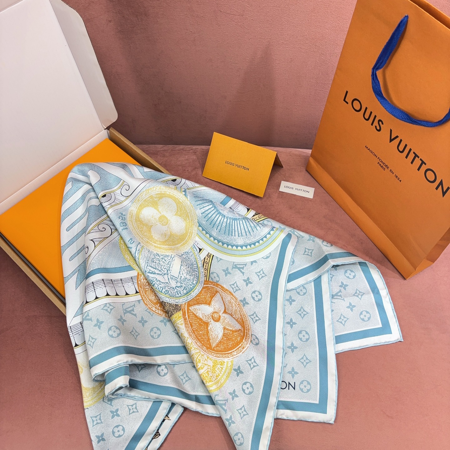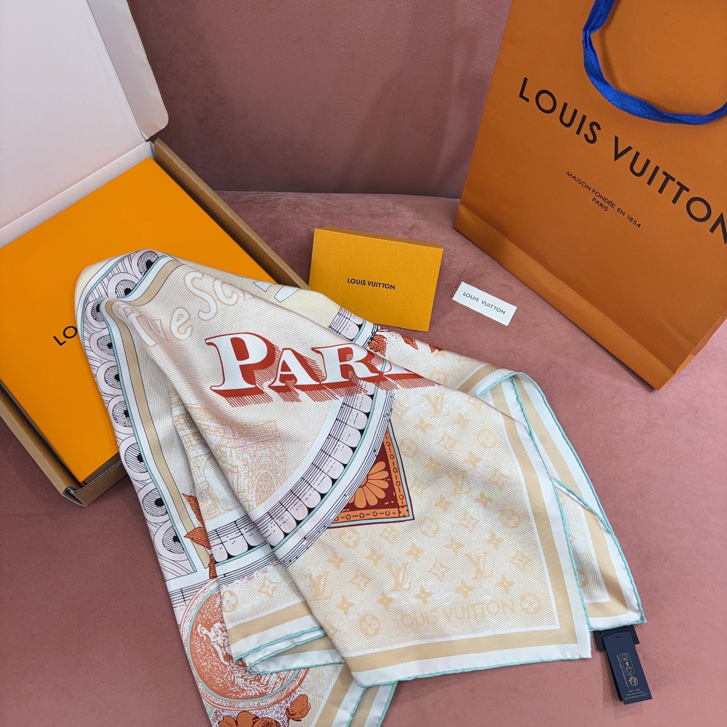 這款方巾靈感取自 19 世紀末的廣告海報設計,結合LV經典Monogram背景與繽紛的行李箱圖騰、旅行貼紙元素,彷彿一秒穿越回最初的輝煌年代。
