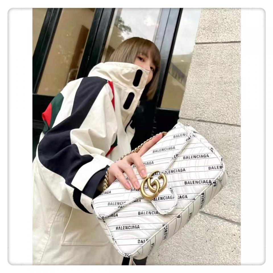 將GG Marmont 滿飾斜排BLCG品牌徽標,搭配醒目雙G扣搭扣,浪漫呈現兩個品牌設計語言的創意融合。