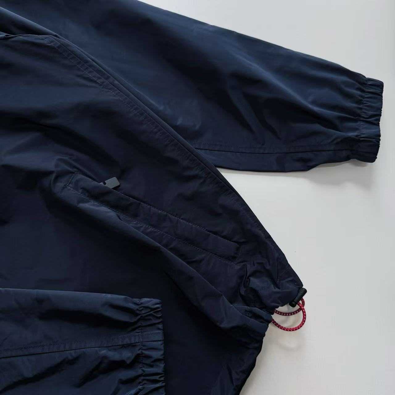 這款夾克在細節處完美示範了何謂「機能優雅」。整體剪裁挺闊且俐落,連帽處巧妙加入了隱藏式抽繩設計,搭配亮眼的紅色編織繩與霧面黑調節扣,在低調中點綴出充滿活力的視覺跳色。
