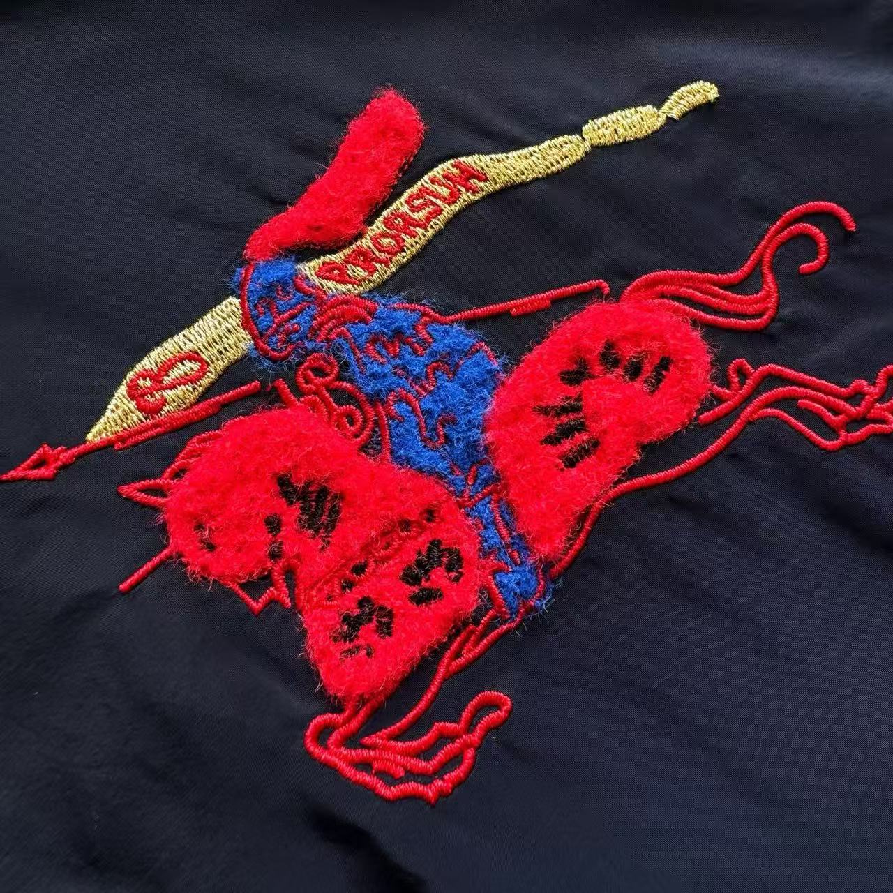 設計亮點聚焦於胸前極具層次的戰馬徽標,不同於一般平面的刺繡,這款單品大膽採用了複合工藝,讓圖騰在輕盈的材料上呈現出如立體浮雕般的視覺張力。