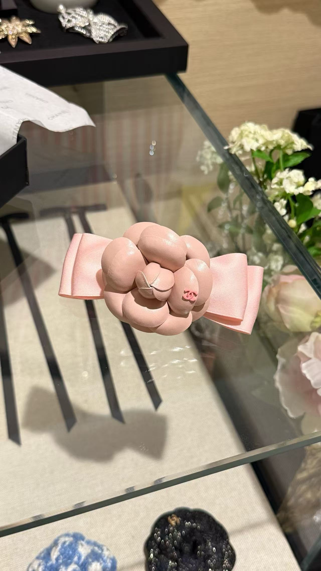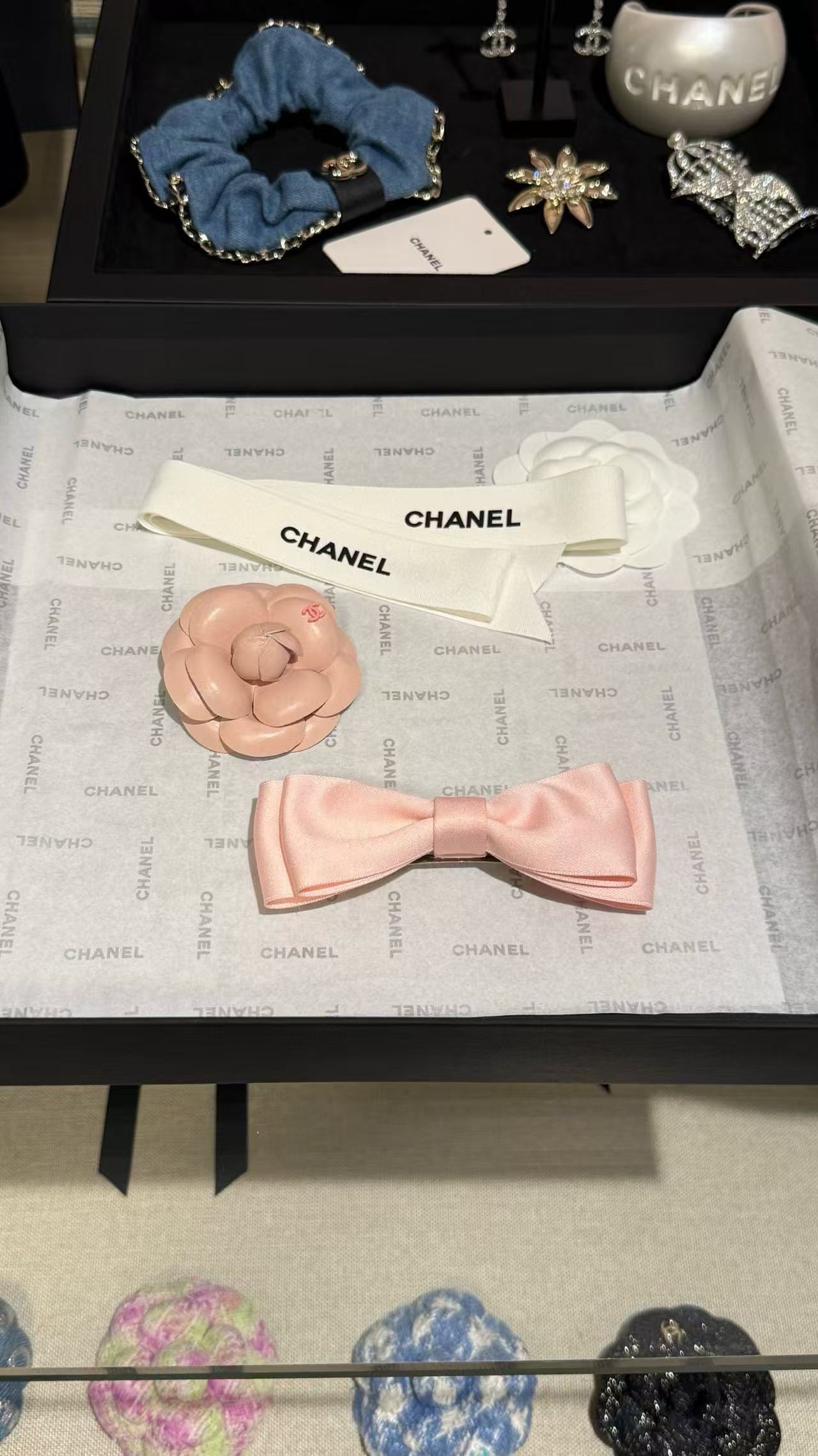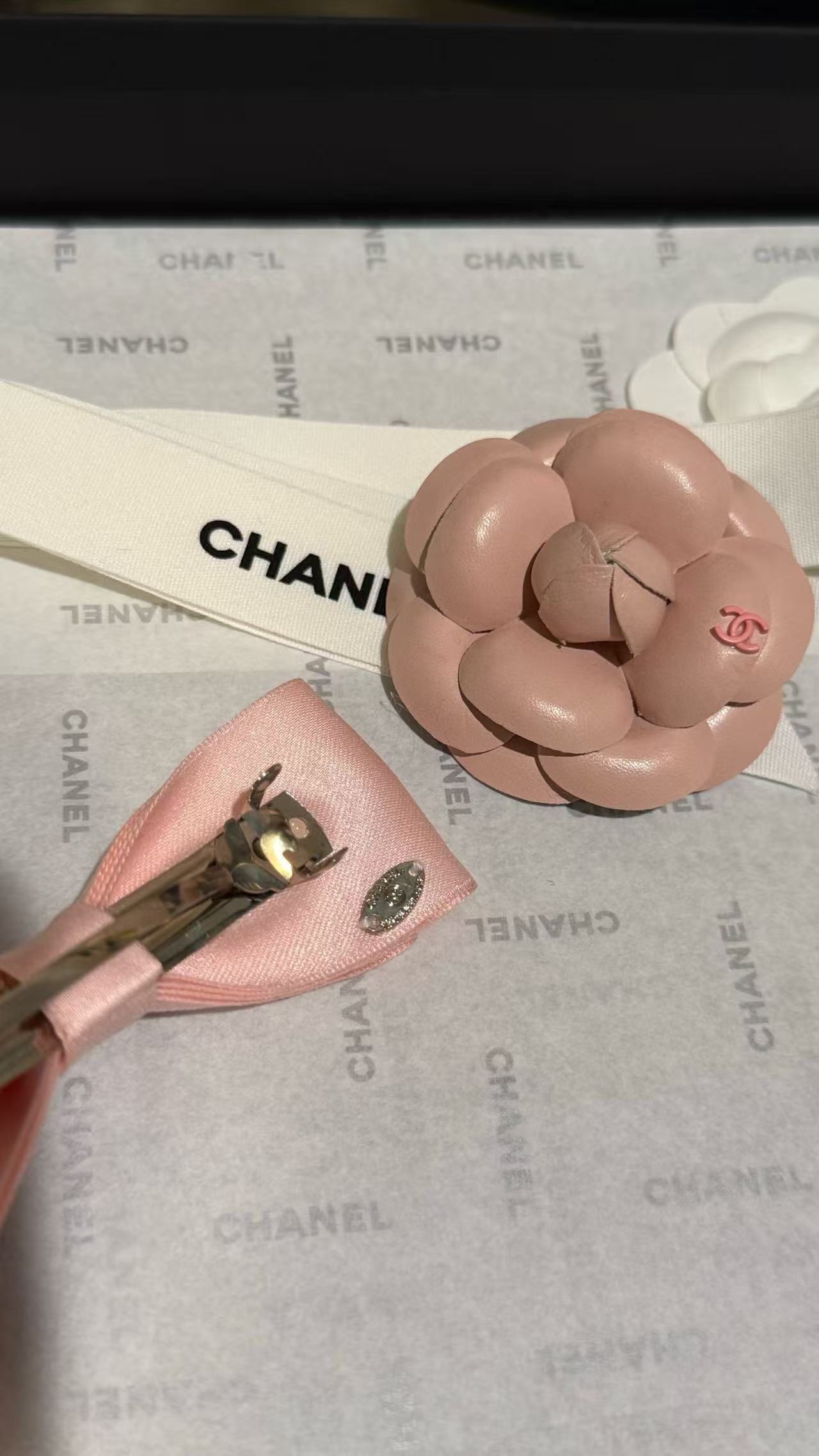 這款配件主打蝴蝶結發夾與山茶花胸針的雙重功能,淺粉色調溫柔不張揚,緞帶蝴蝶結輕盈飄逸,搭配粉色皮質山茶花,宛如C家經典花卉的現代詮釋。