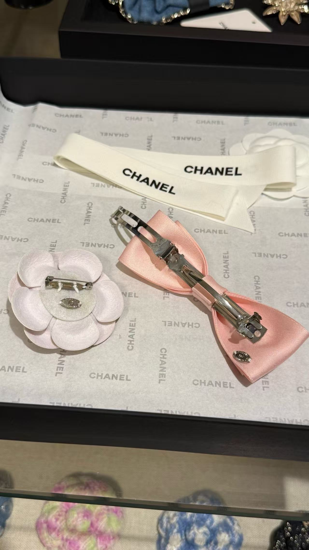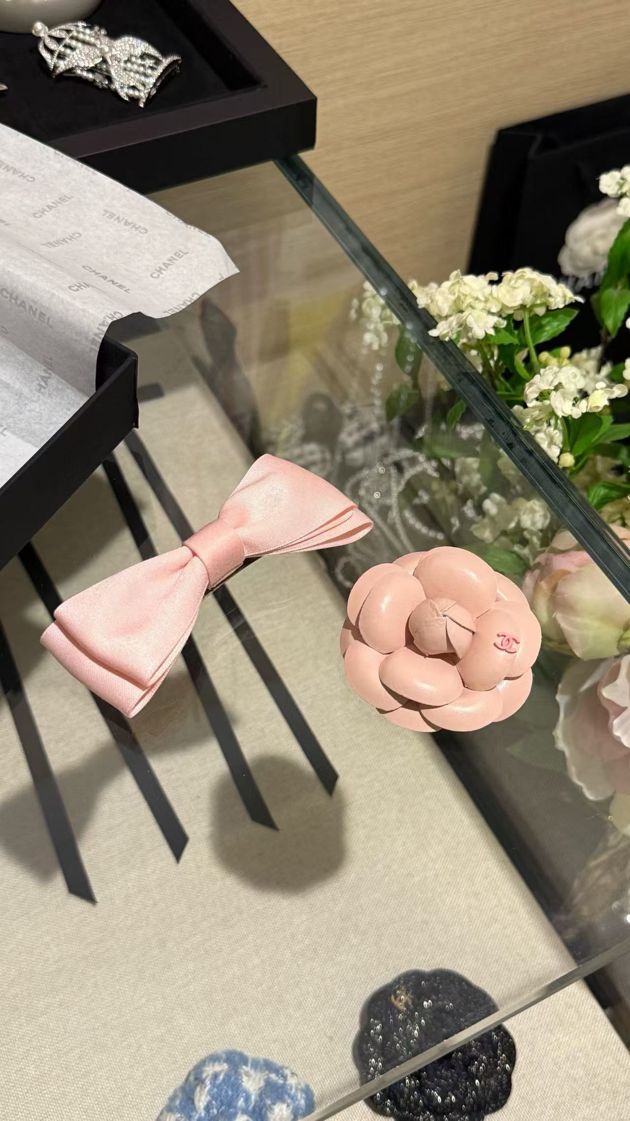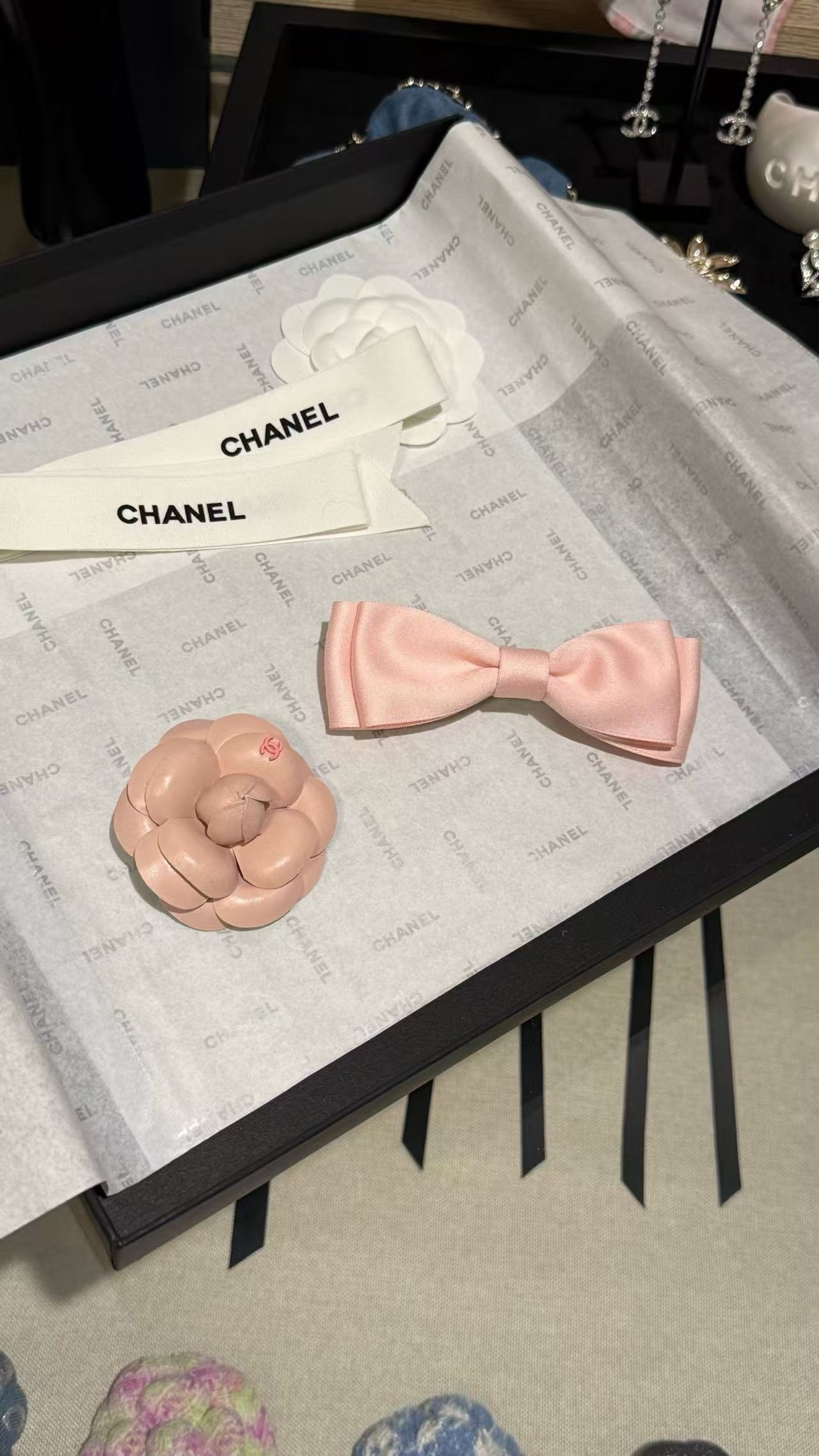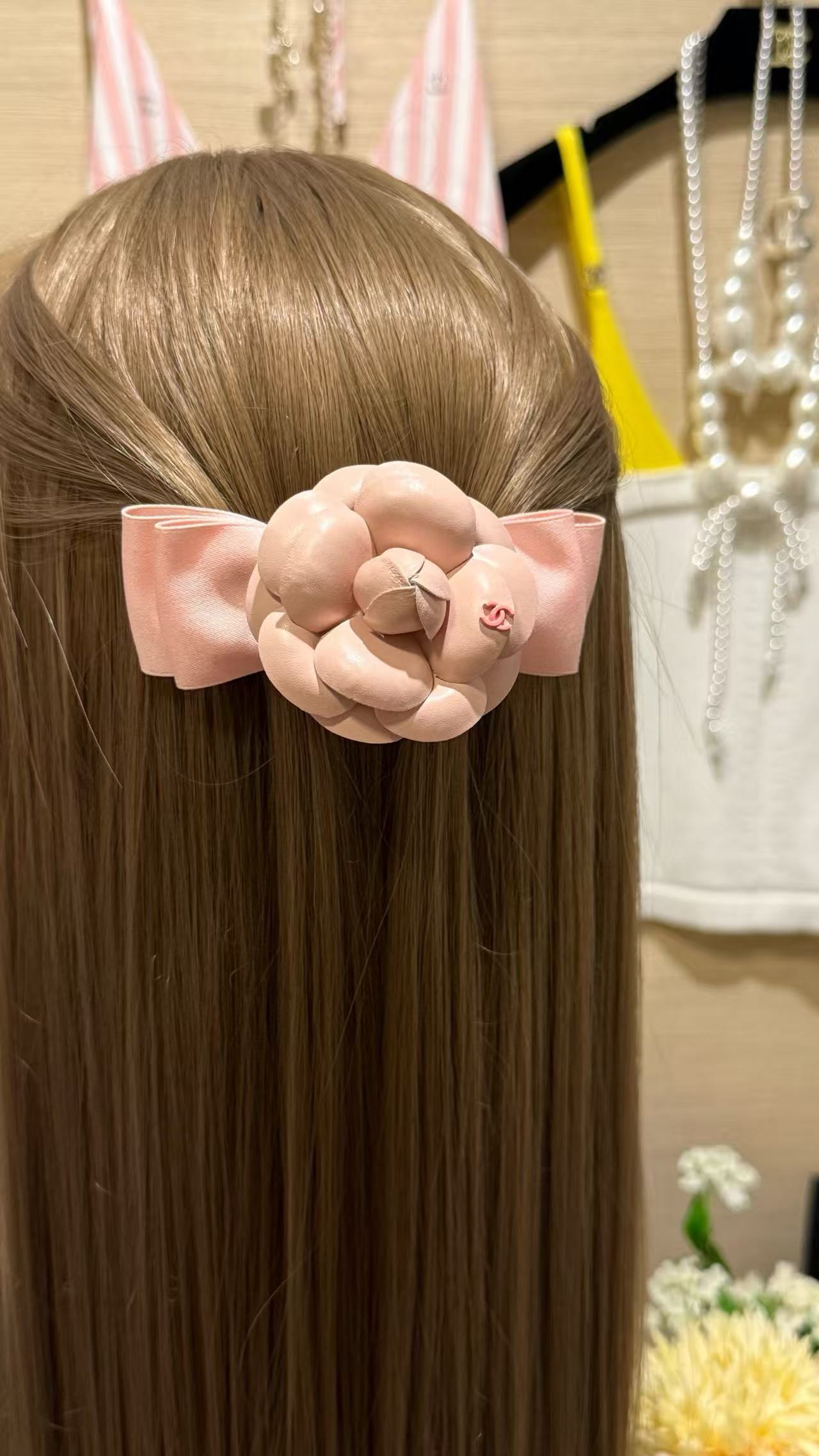 這款配件主打蝴蝶結發夾與山茶花胸針的雙重功能,淺粉色調溫柔不張揚,緞帶蝴蝶結輕盈飄逸,搭配粉色皮質山茶花,宛如C家經典花卉的現代詮釋。