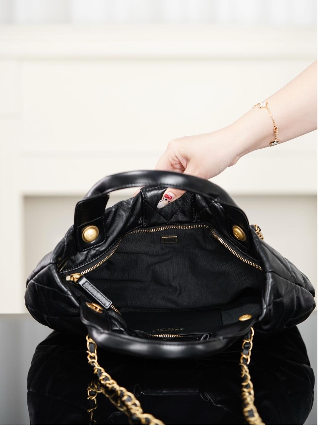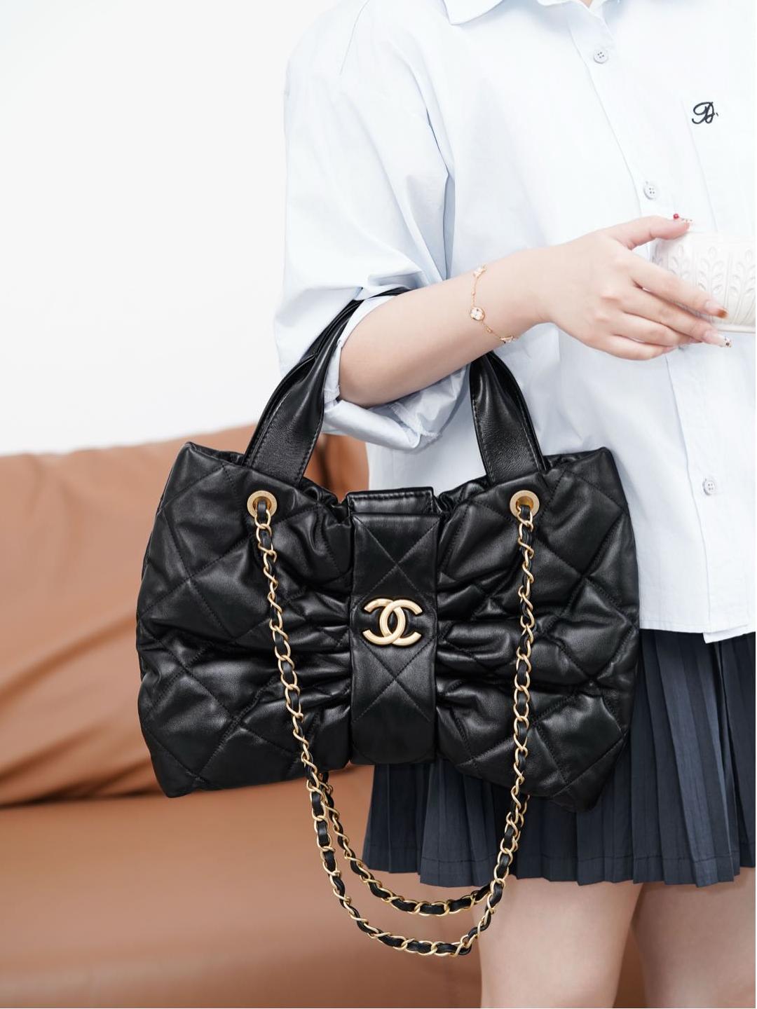 皮穿鏈條延續品牌經典設計,雙 C 字母刻印清晰立體,整體質感極高。
