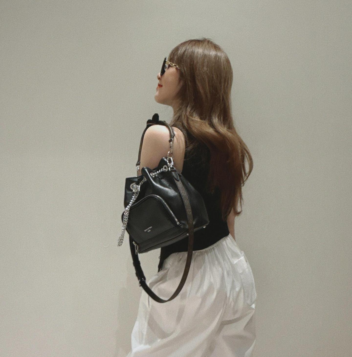 這款水桶包選用高級小羊皮打造,細膩柔軟中帶有微微光澤,柔軟觸感不僅提升整體質感,也更貼合日常穿搭。