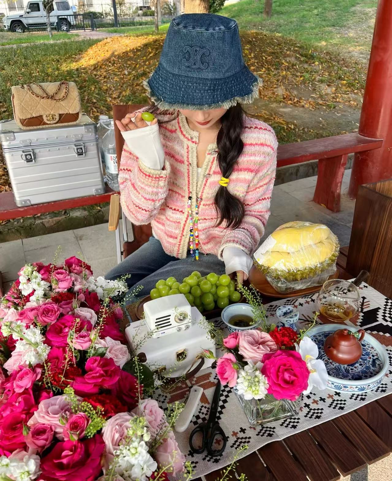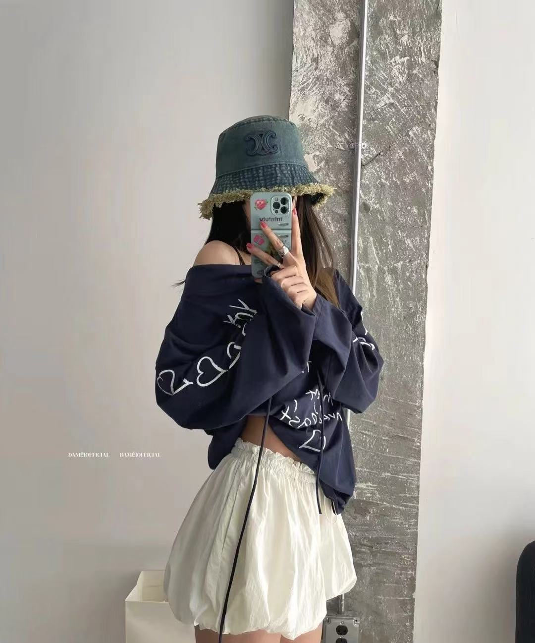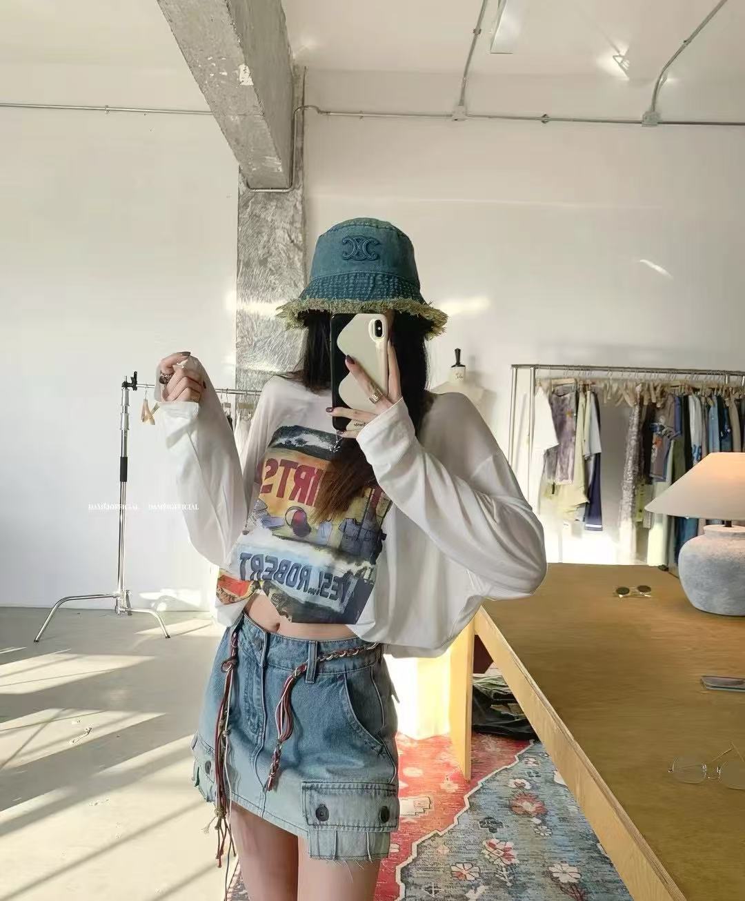 水洗牛仔材質搭配流蘇毛邊設計,帽檐以雙層流蘇打造豐富層次感,搭配明線車縫與做舊擦色工藝,細節滿滿,風格自由不受拘束。