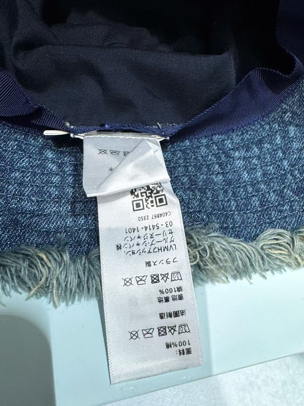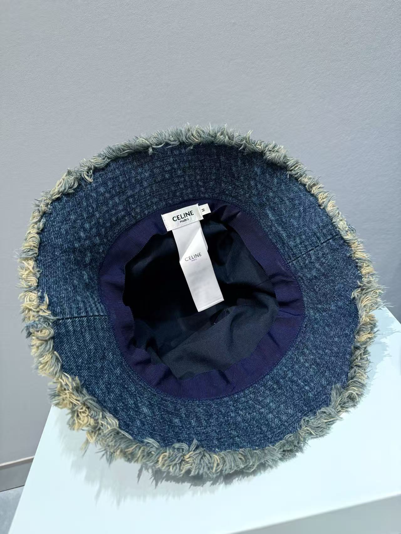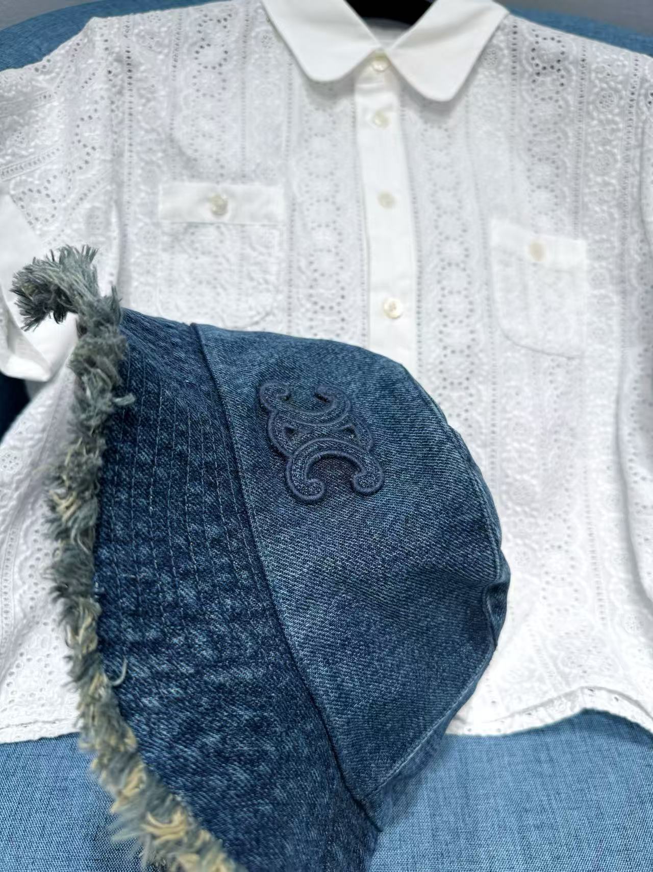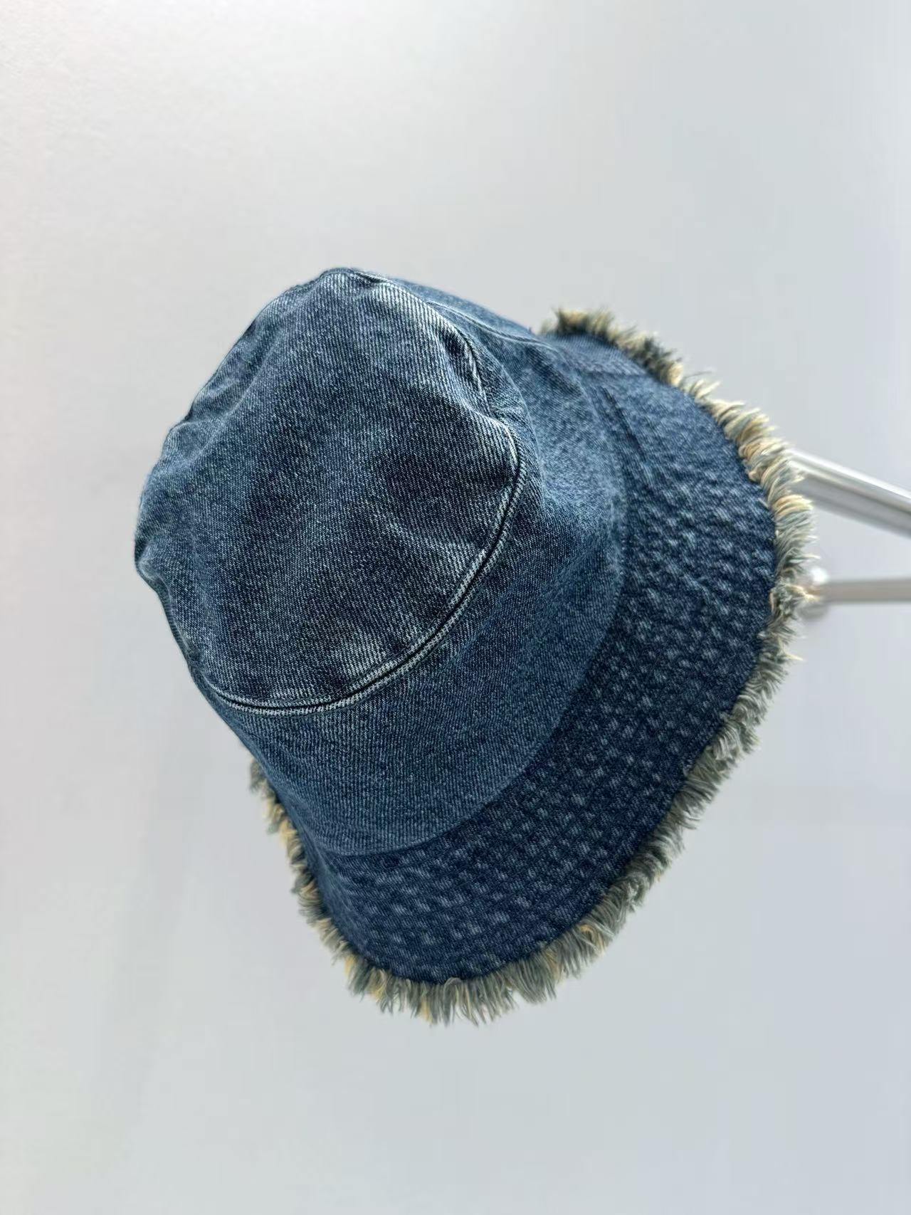 選用水洗牛仔布製作,帽頂以手工做舊處理增添復古質感,帽檐邊緣加上兩層流蘇設計,呈現自然柔和的毛邊效果。