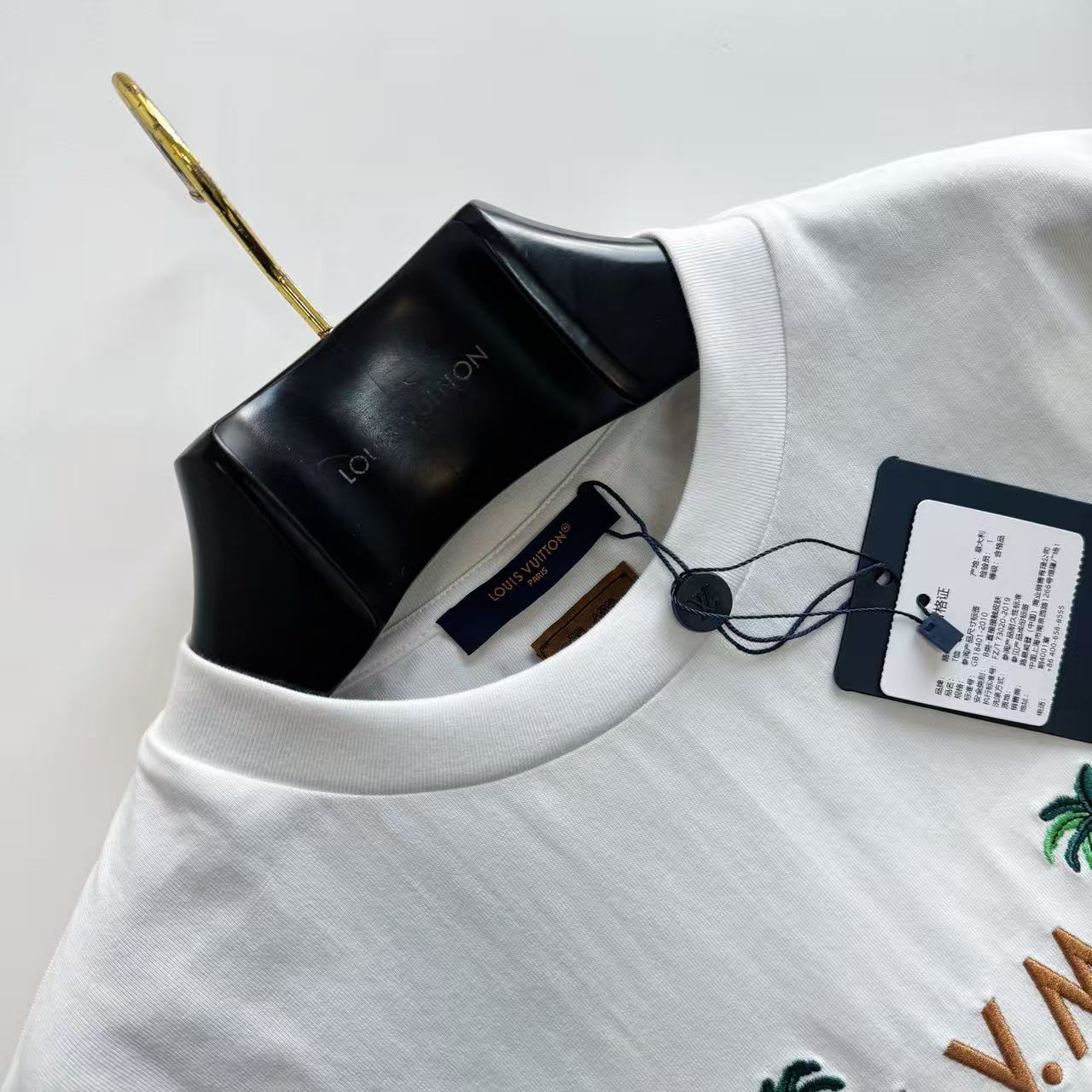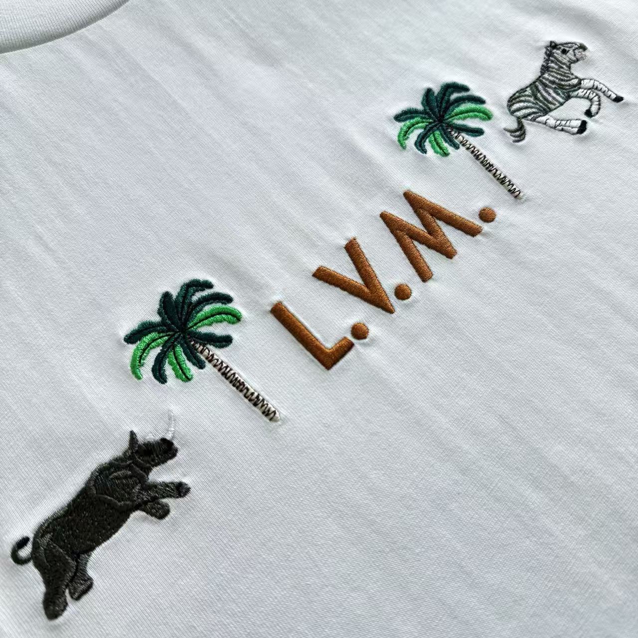 這款單品最令人驚嘆的,莫過於胸前那極其複雜的圖案設計。它並非單一的印花或簡單刺繡,而是融合了挨針、榻榻米、雙針三種不同針法。透過多重工藝的交織,讓棕櫚樹的葉片與動物紋理呈現出鮮明的立體感與手工溫度。