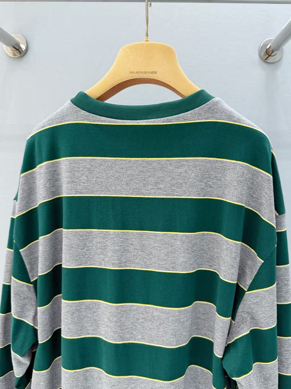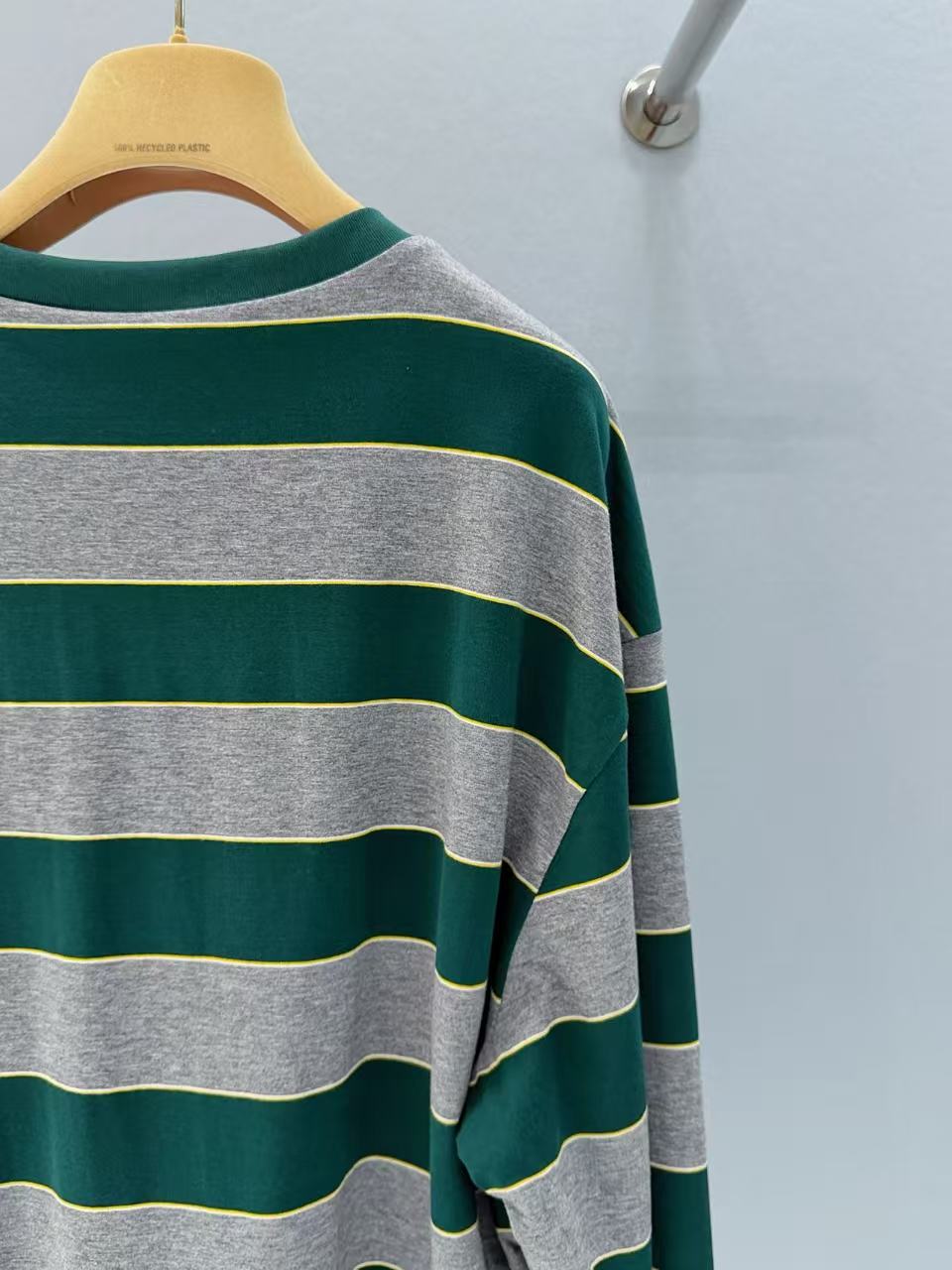 復古墨綠配上柔和煙灰條紋,經典中帶層次,再點綴細閃的淺黃線條,基礎款瞬間變得很有細節感,不會單調又超級顯貴。
