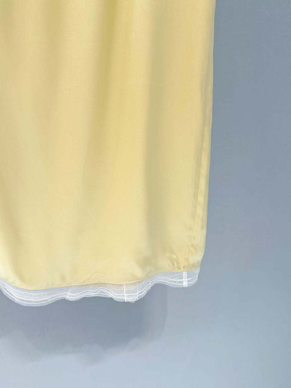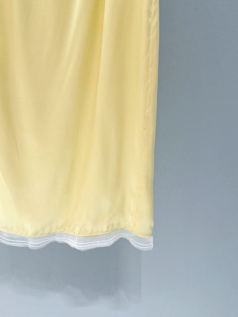 工藝特色: 裙襬飾有細緻蕾絲拼接,光澤度飽滿且手感絲滑。