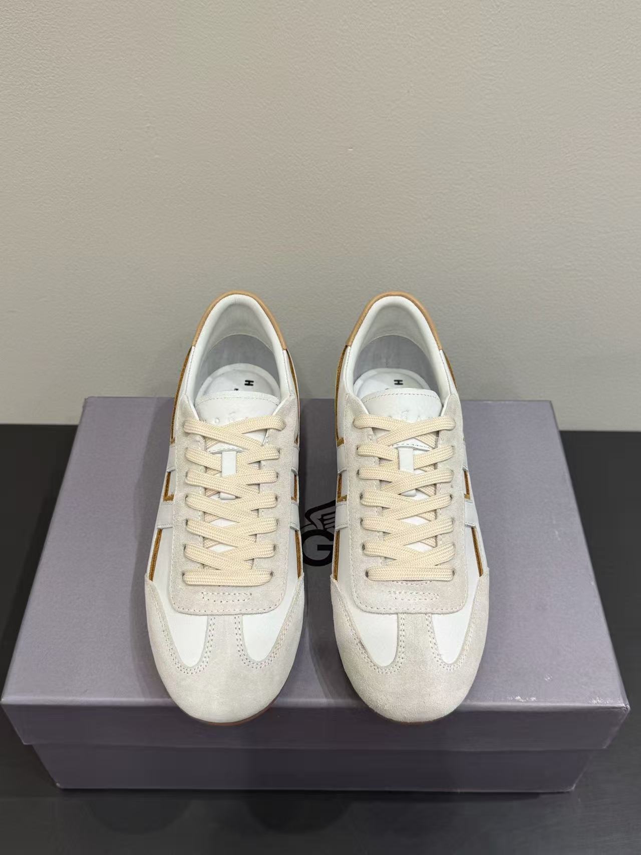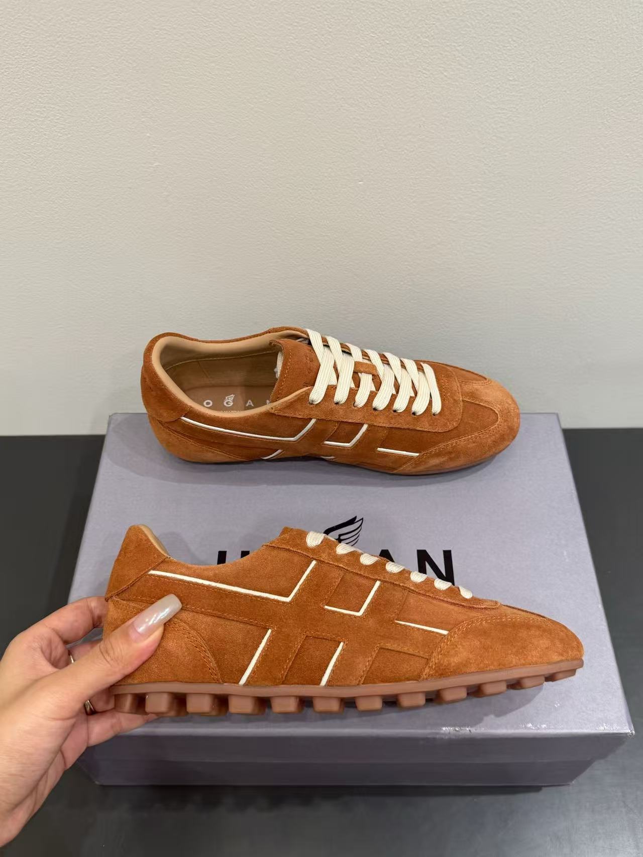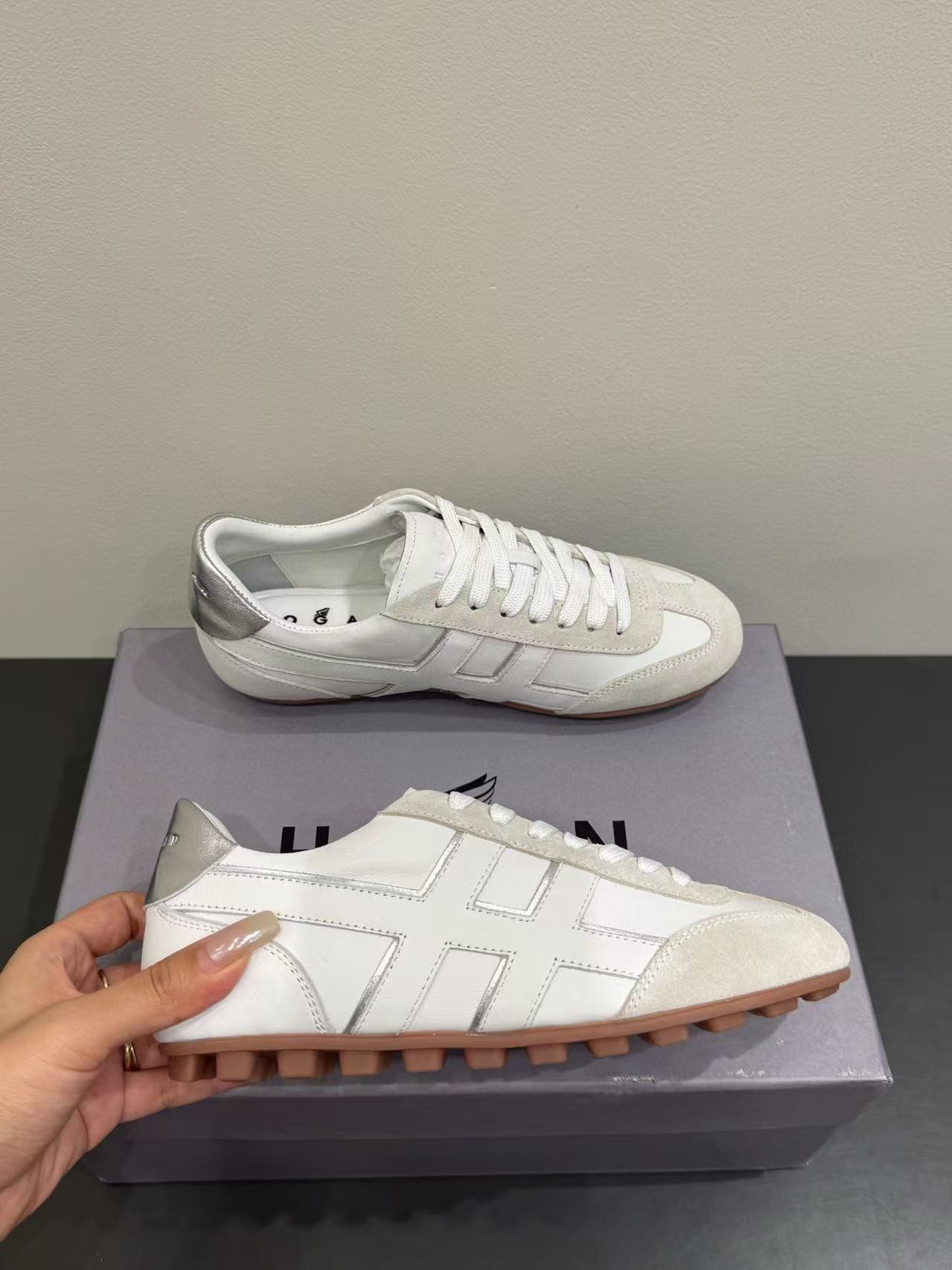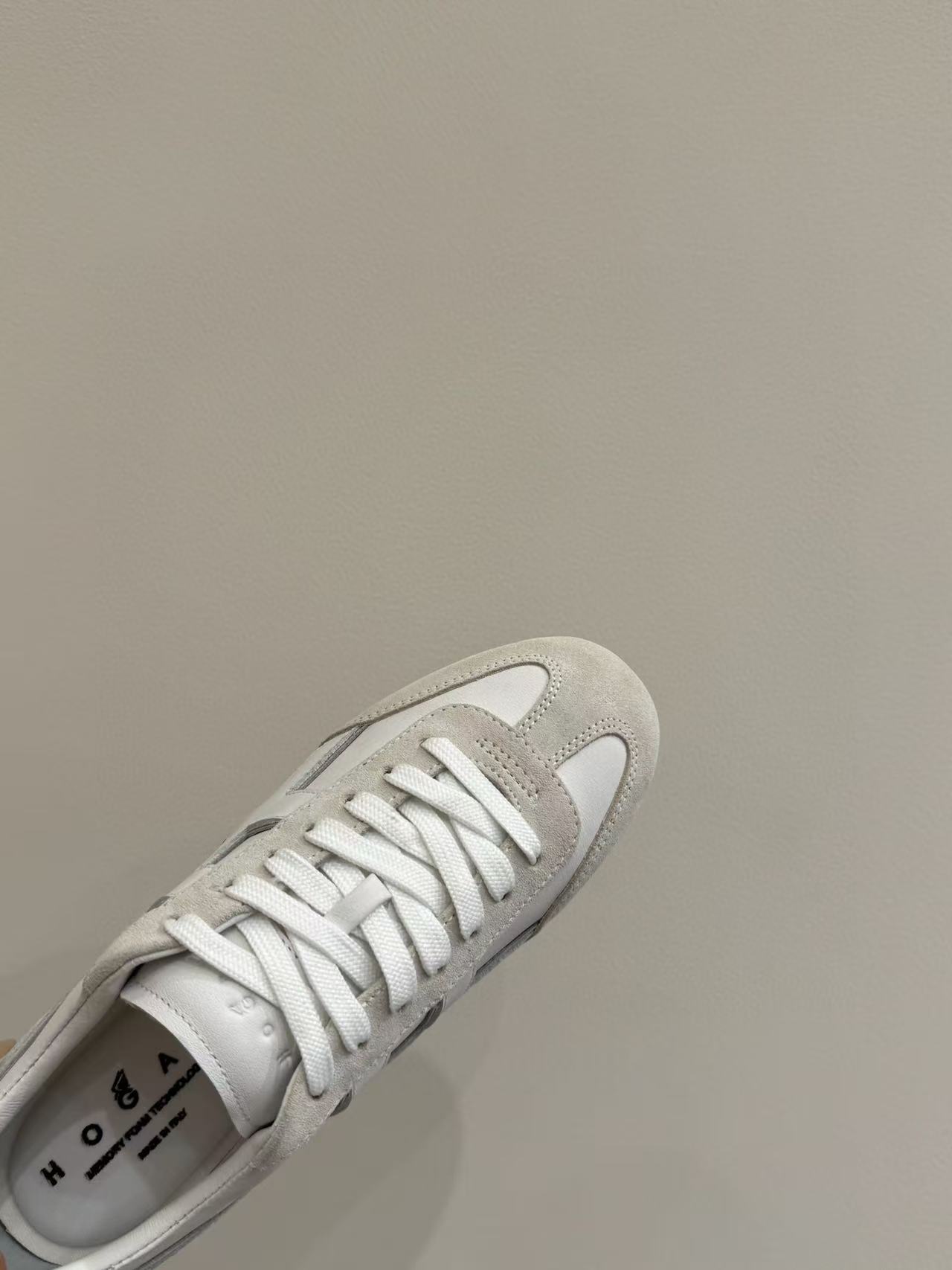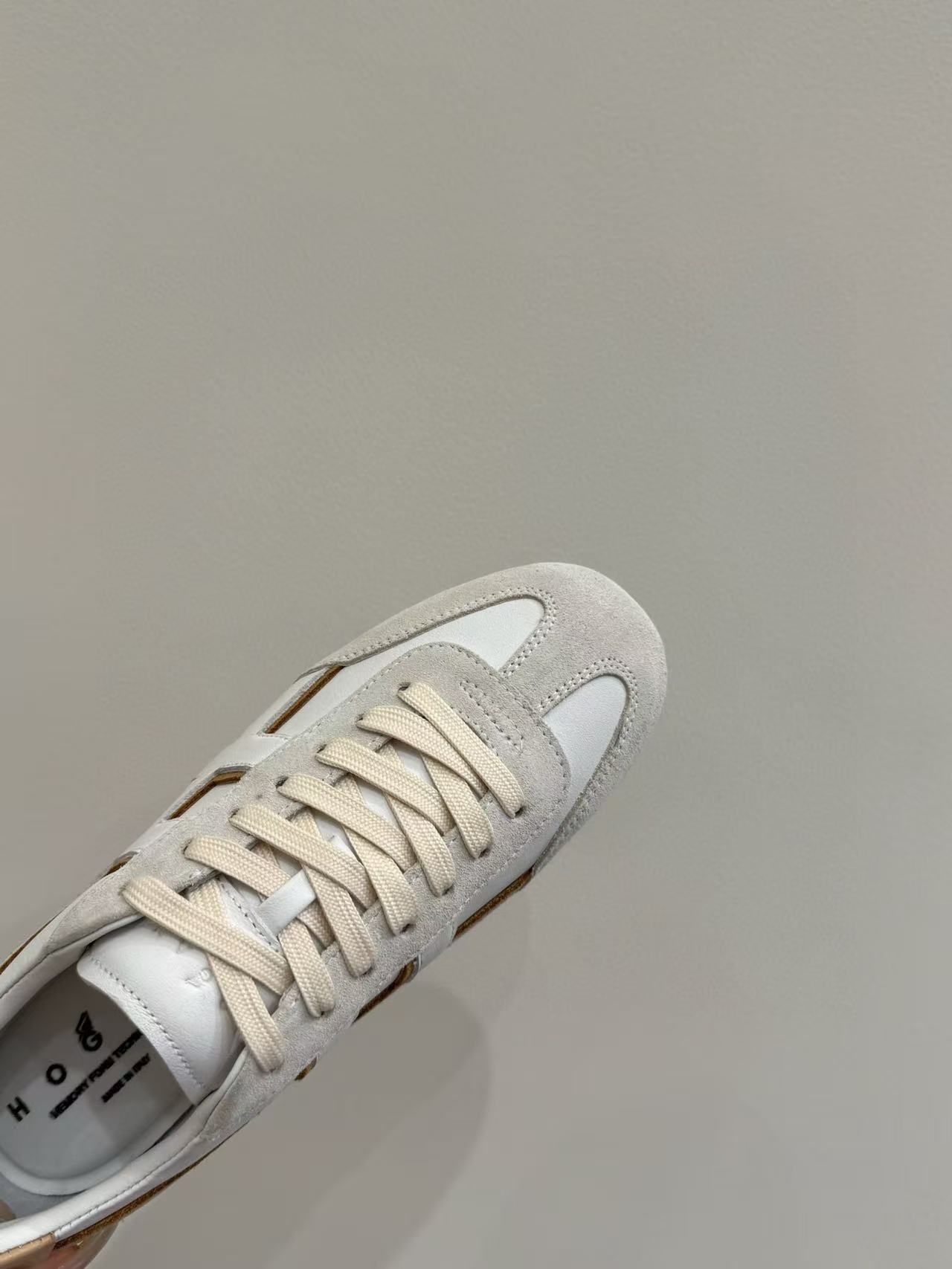鞋身沿邊設計極富層次感,搭配石洗技術的圓圈線條,增添視覺趣味,完美呈現 Hogan 的現代街頭風格。