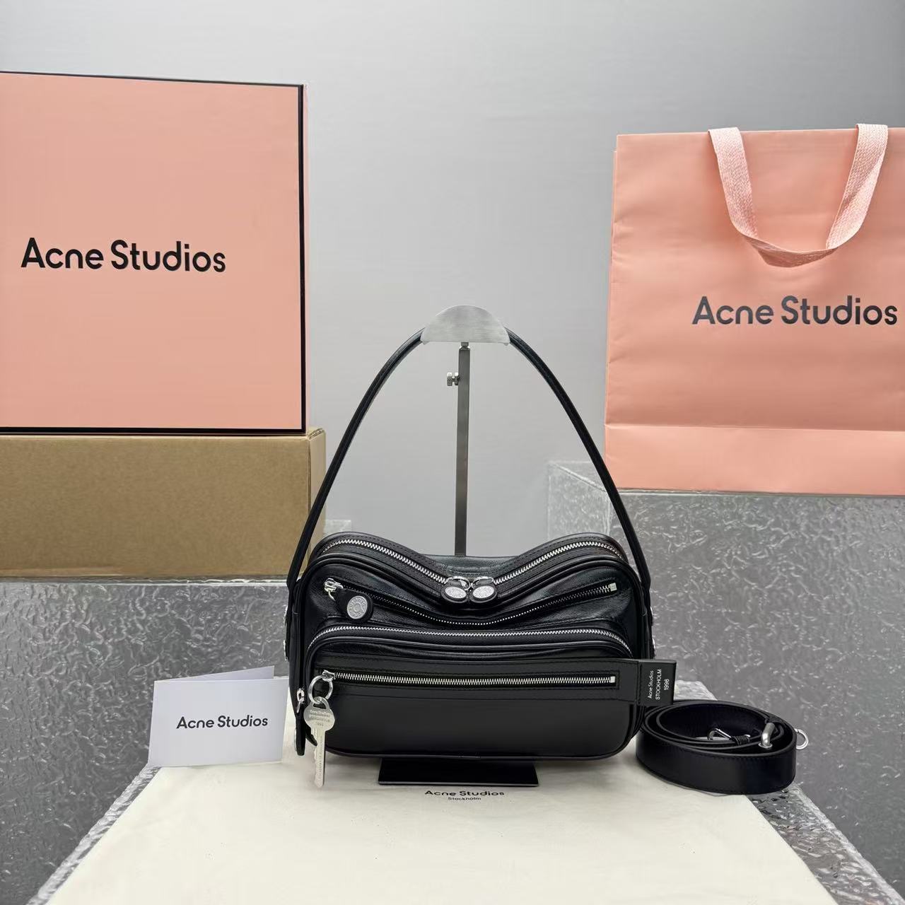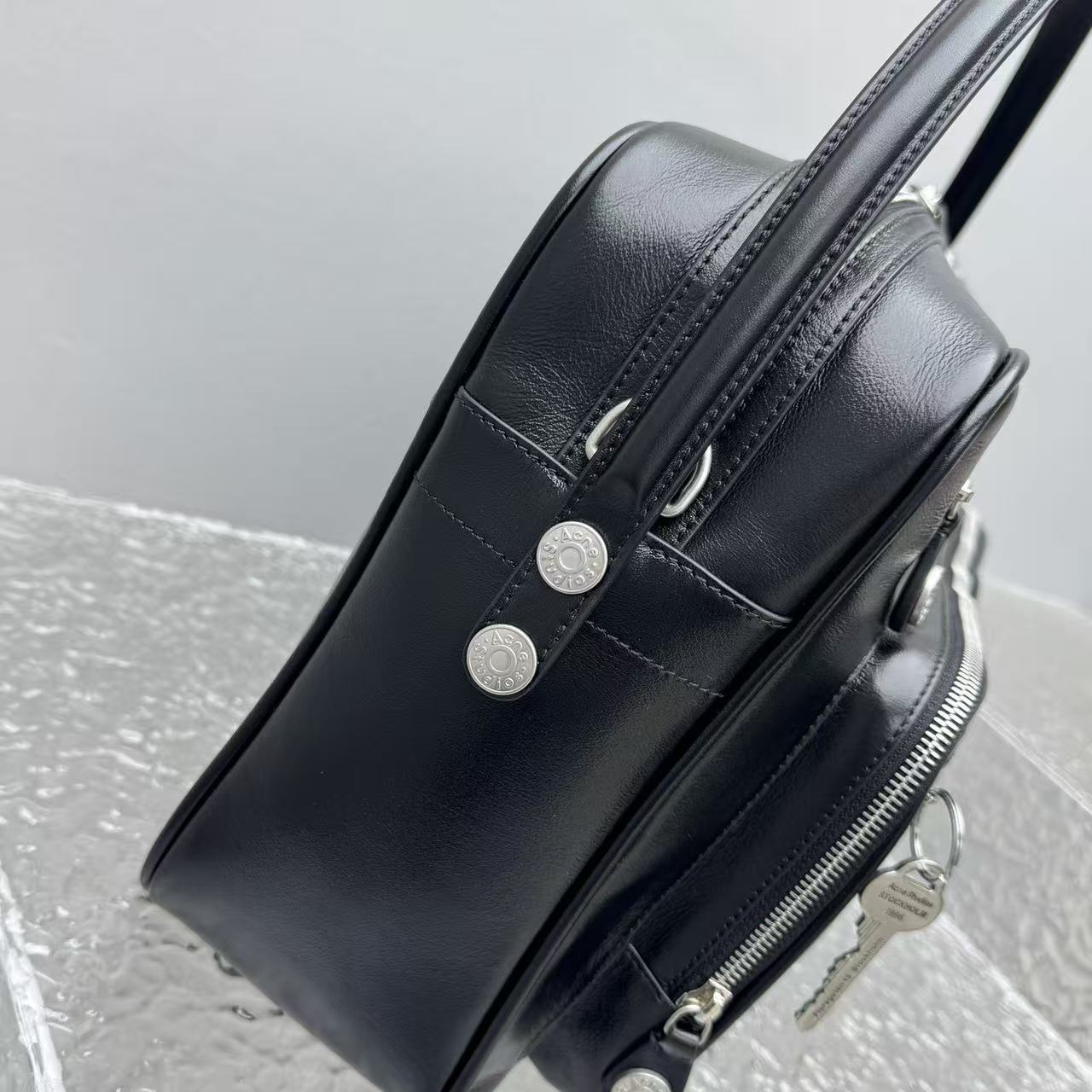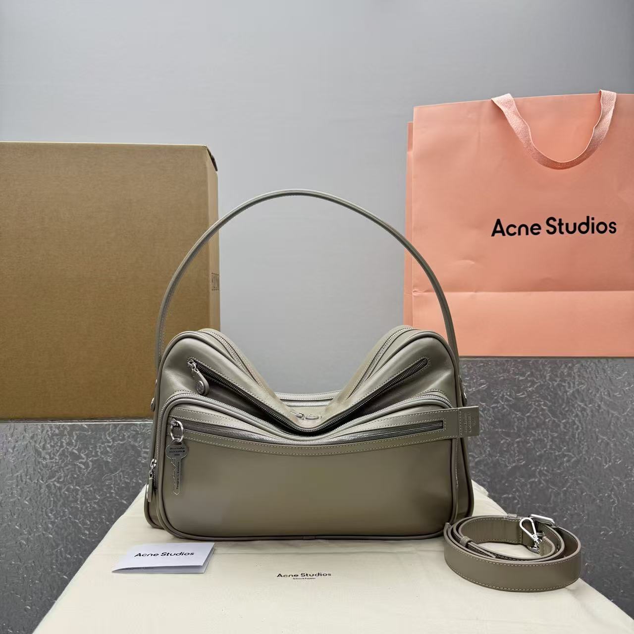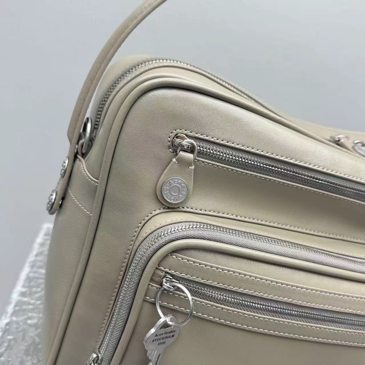 包身標誌性的復古鑰匙掛飾,象徵著瑞典傳統門匙的溫潤質感,與冷灰色的皮面形成強烈對比。這種「獨特而不誇張」的細節,正是這款包能成為 26SS 年度爆品的關鍵。