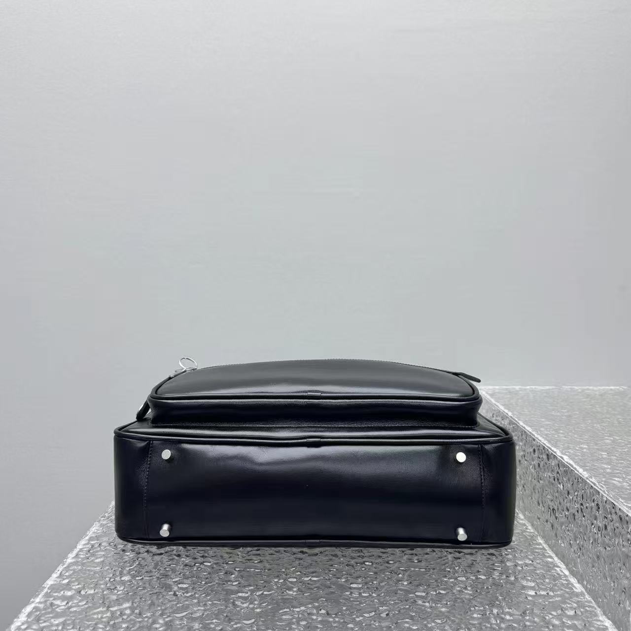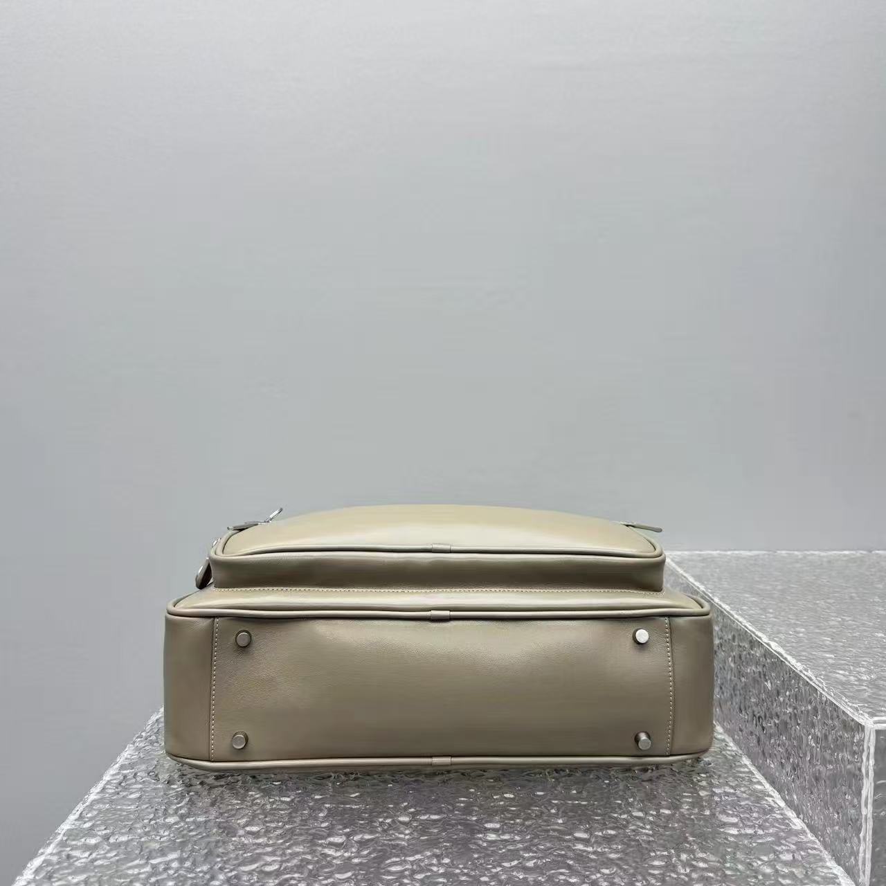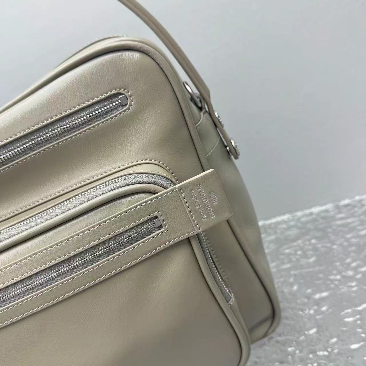 特供冷灰色平滑牛皮: 嚴選高品質全粒面皮胚,皮質厚實且具有細膩的油脂感。這種面料不僅耐磨經穿,且會隨著使用時間的增加,呈現出一種自然的半啞光光澤,越用越有味道。