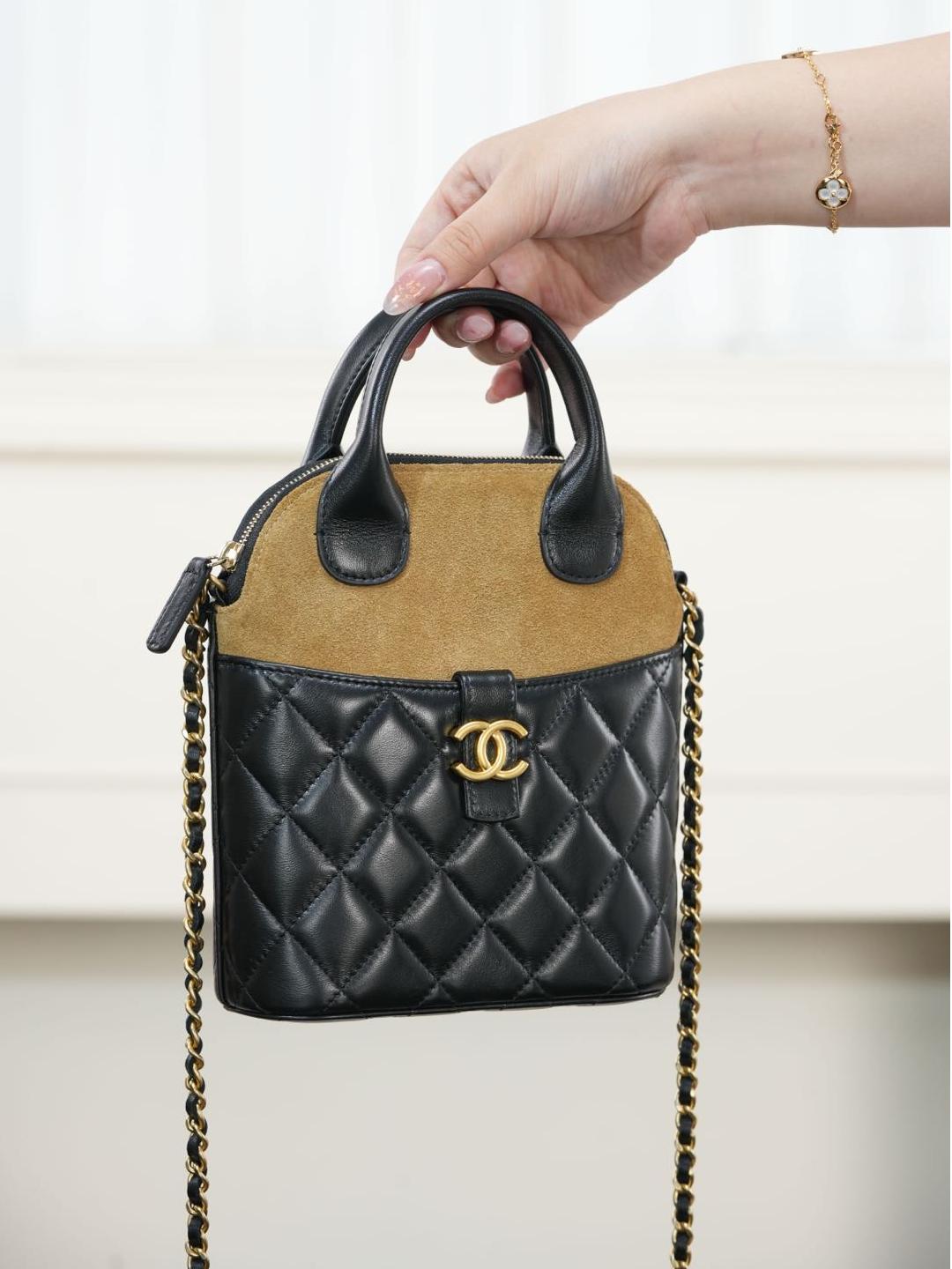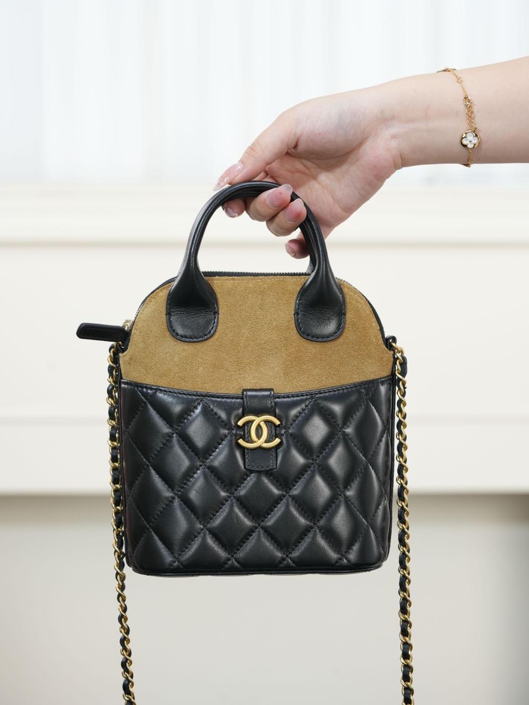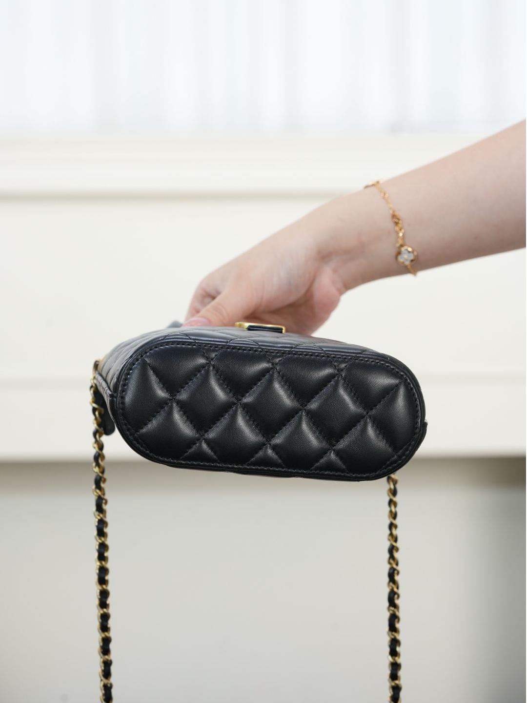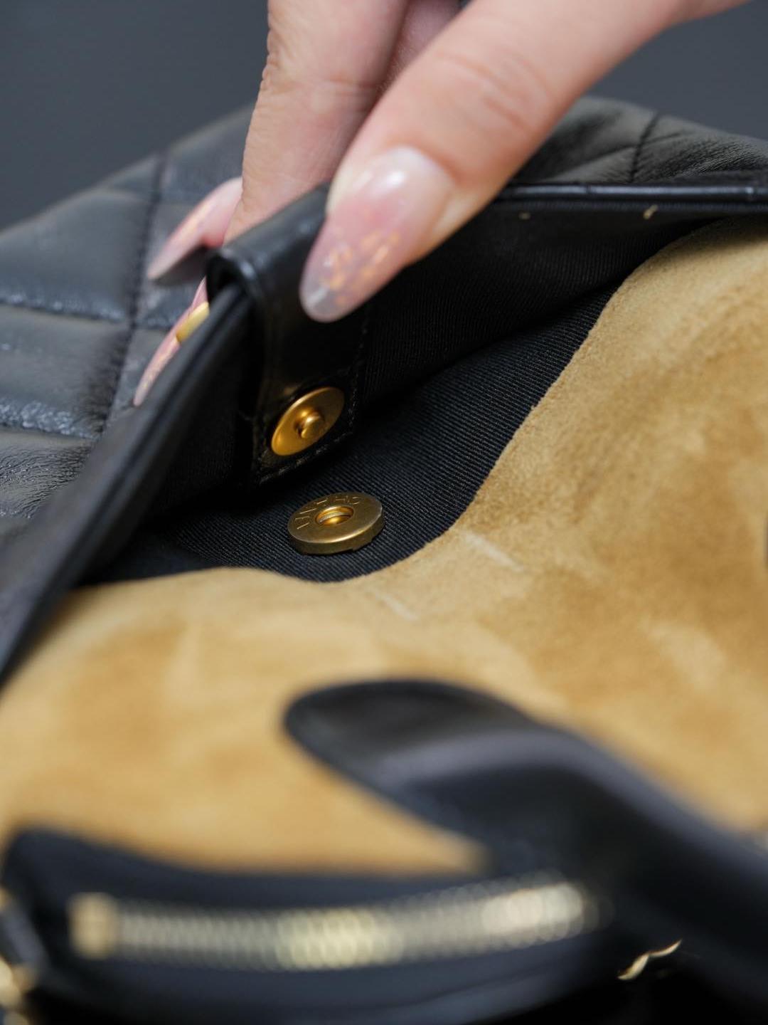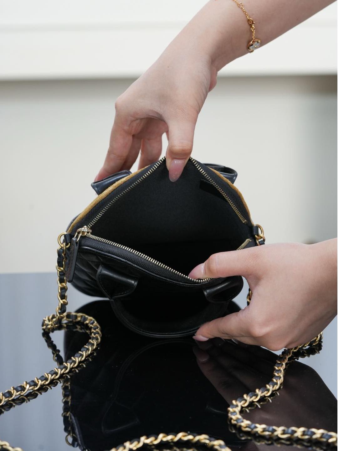設計上依舊延續經典,前側雙 C 扣打開後內裡設有小隔層,既能手提,也能搭配皮穿金屬鏈條,實現單肩或斜背的多種背法。