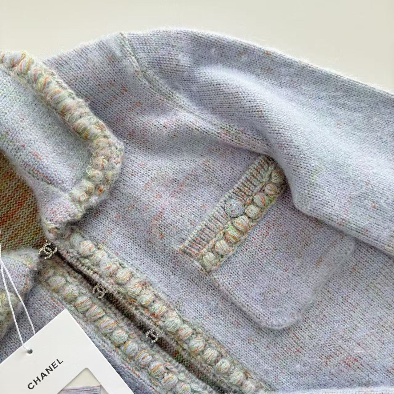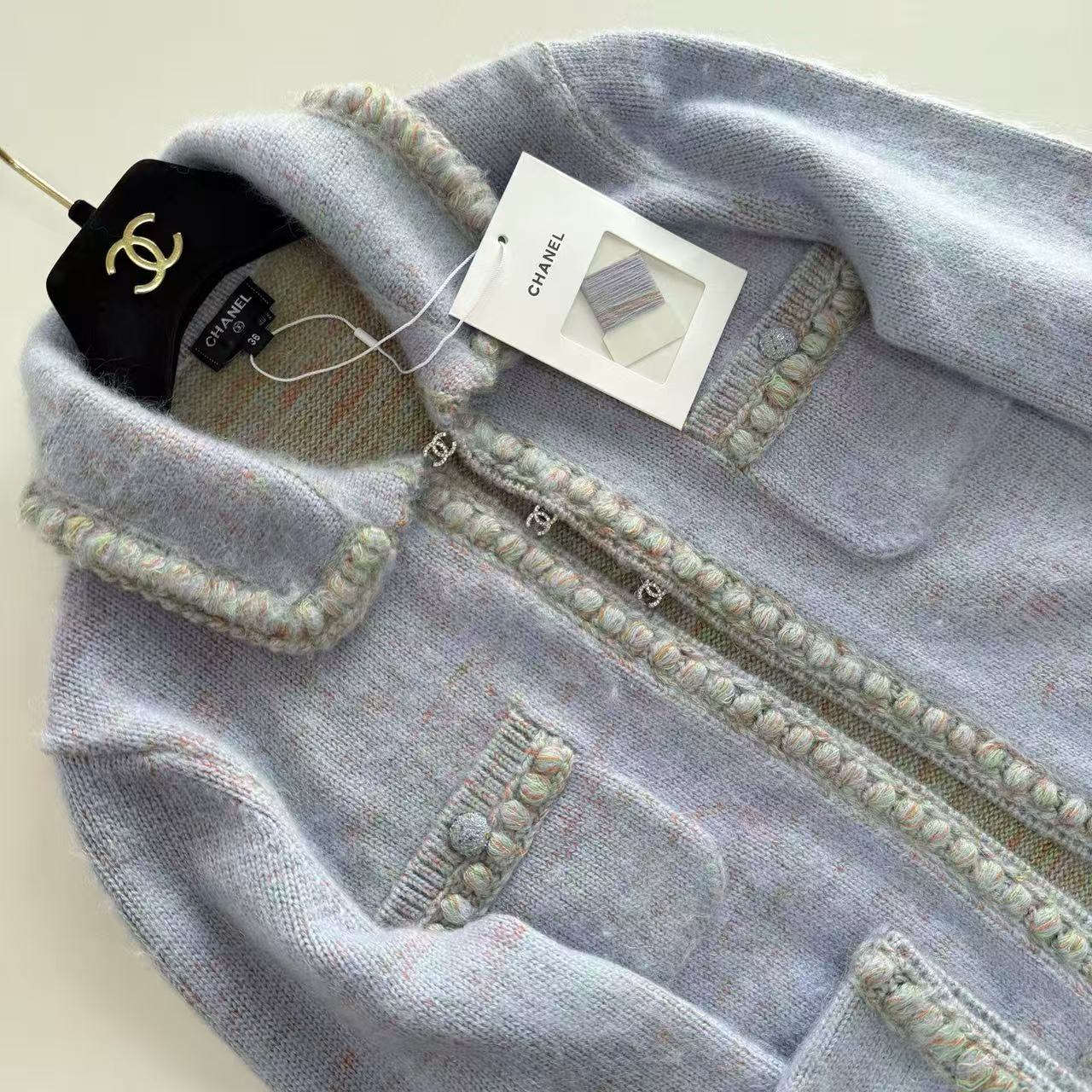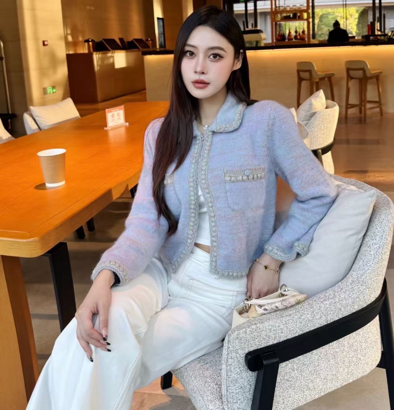 這款開衫由 YB 開發、高版出品,拆解正品打造,還原度高達 98% 以上。標誌性的水鑽雙 C 勾扣一比一訂製,閃耀卻不浮誇;邊緣全採純手工點鑽包邊,每顆水鑽都像小星星般bling bling,放大看細節無可挑剔,滿滿專櫃級奢華感。翻領設計增添一絲正式感,搭配裙裝或牛仔褲都超有型。