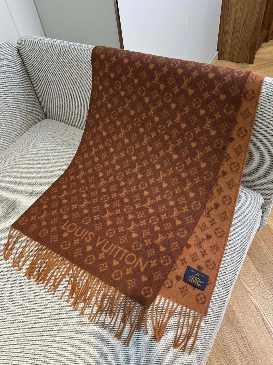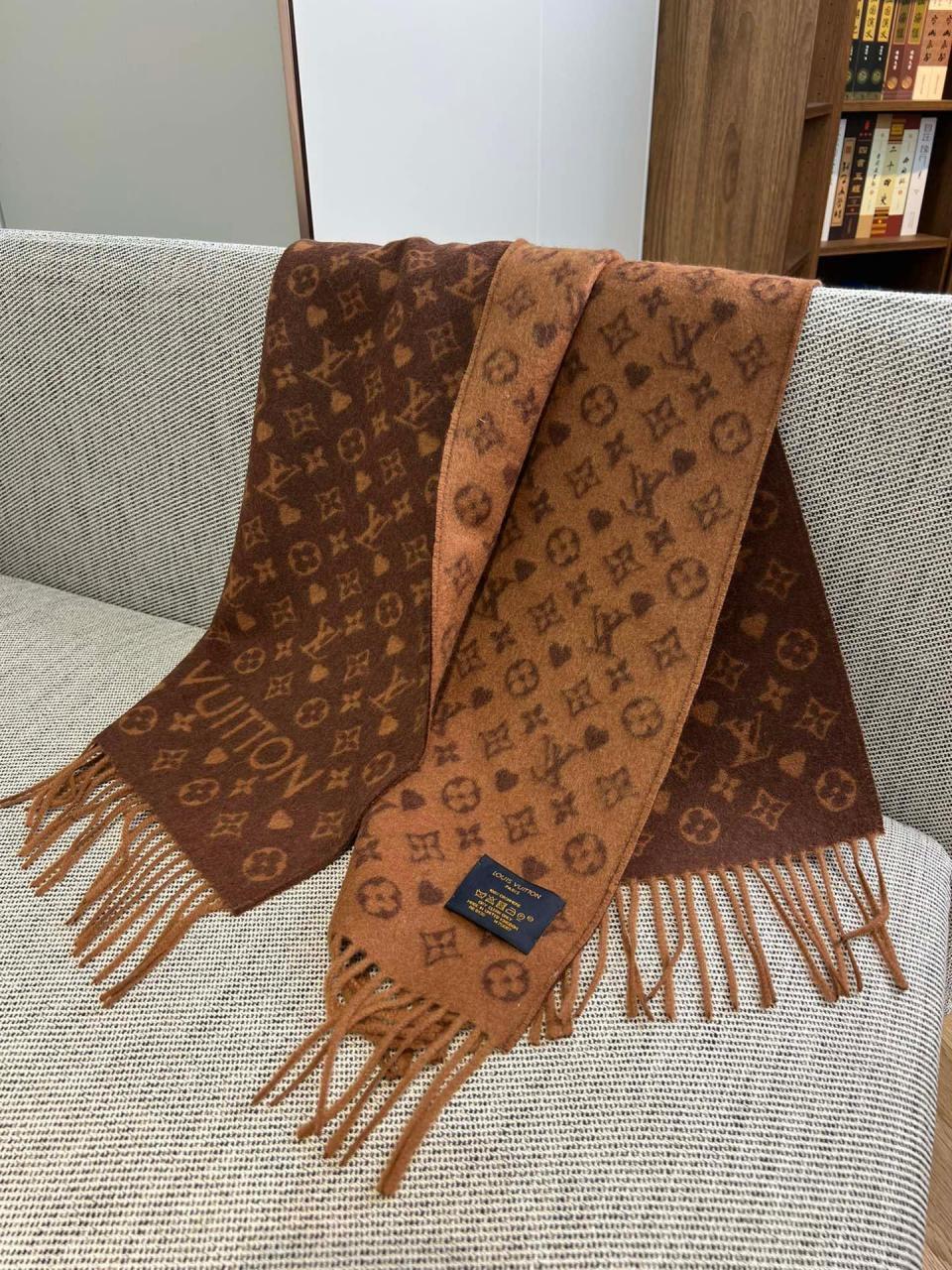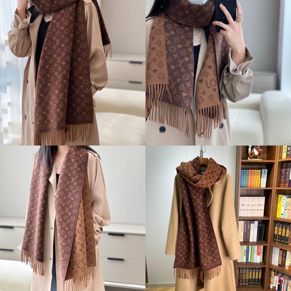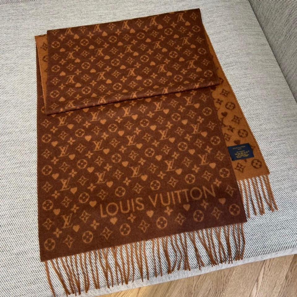 2022秋冬新品 L家滿版老花愛心圖案圍巾(咖啡色) 羊絨材質保暖舒適