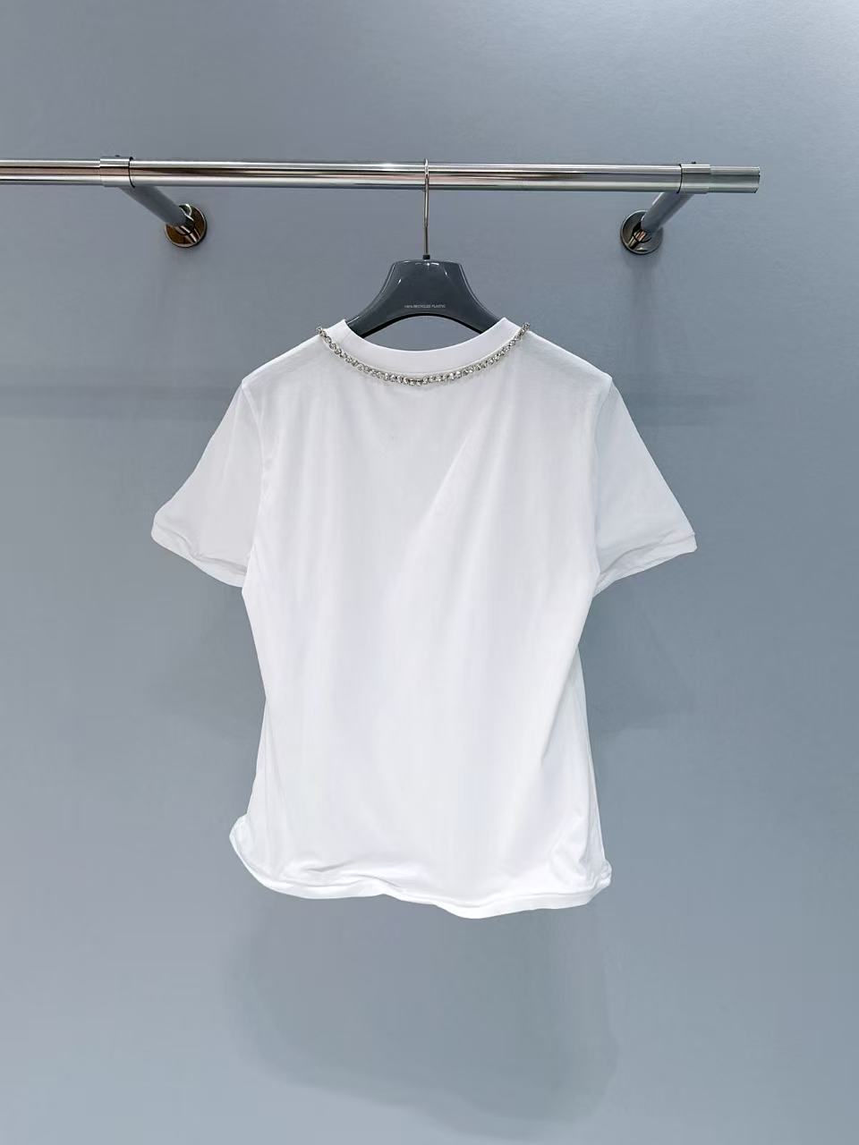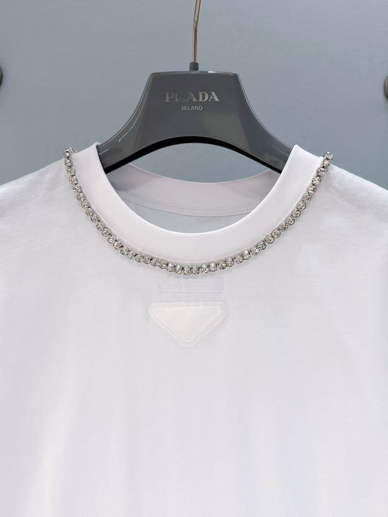 胸口裝飾織物三角形徽標,辨識度滿分;領口一圈鑲鑽點綴,精緻奢華感直接拉滿!