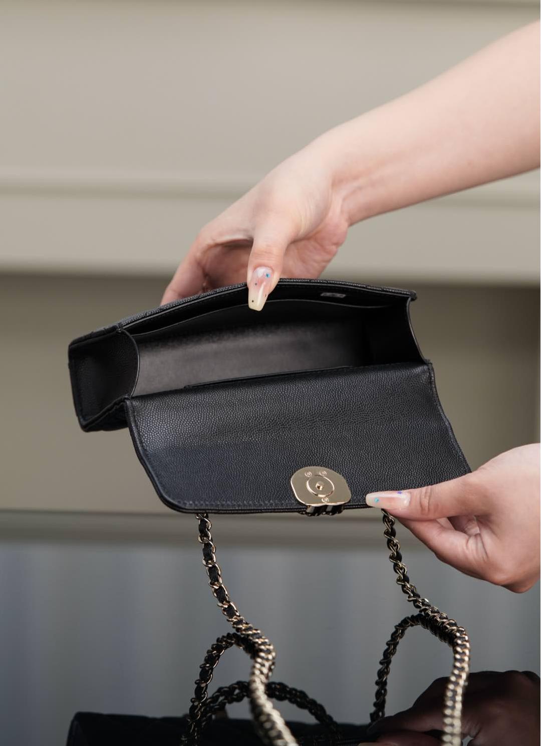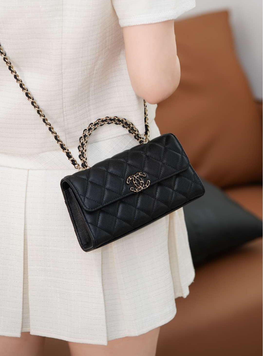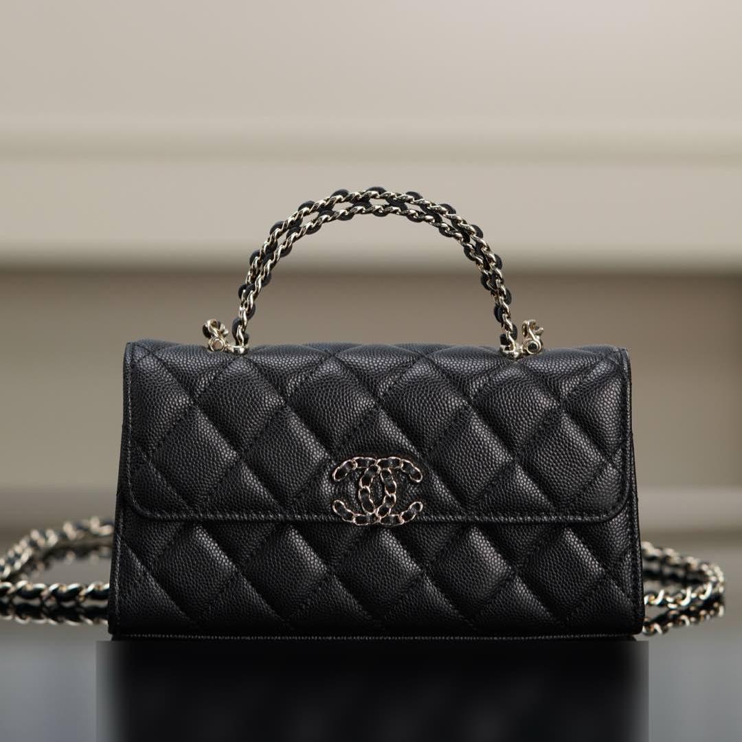 皮穿雙C扣、鏈條設計與手柄細節互相呼應,整體搭配和諧精緻。手提或肩背皆宜,無論是日常上班、約會出遊,甚至參加正式場合,都能展現無可挑剔的品味。