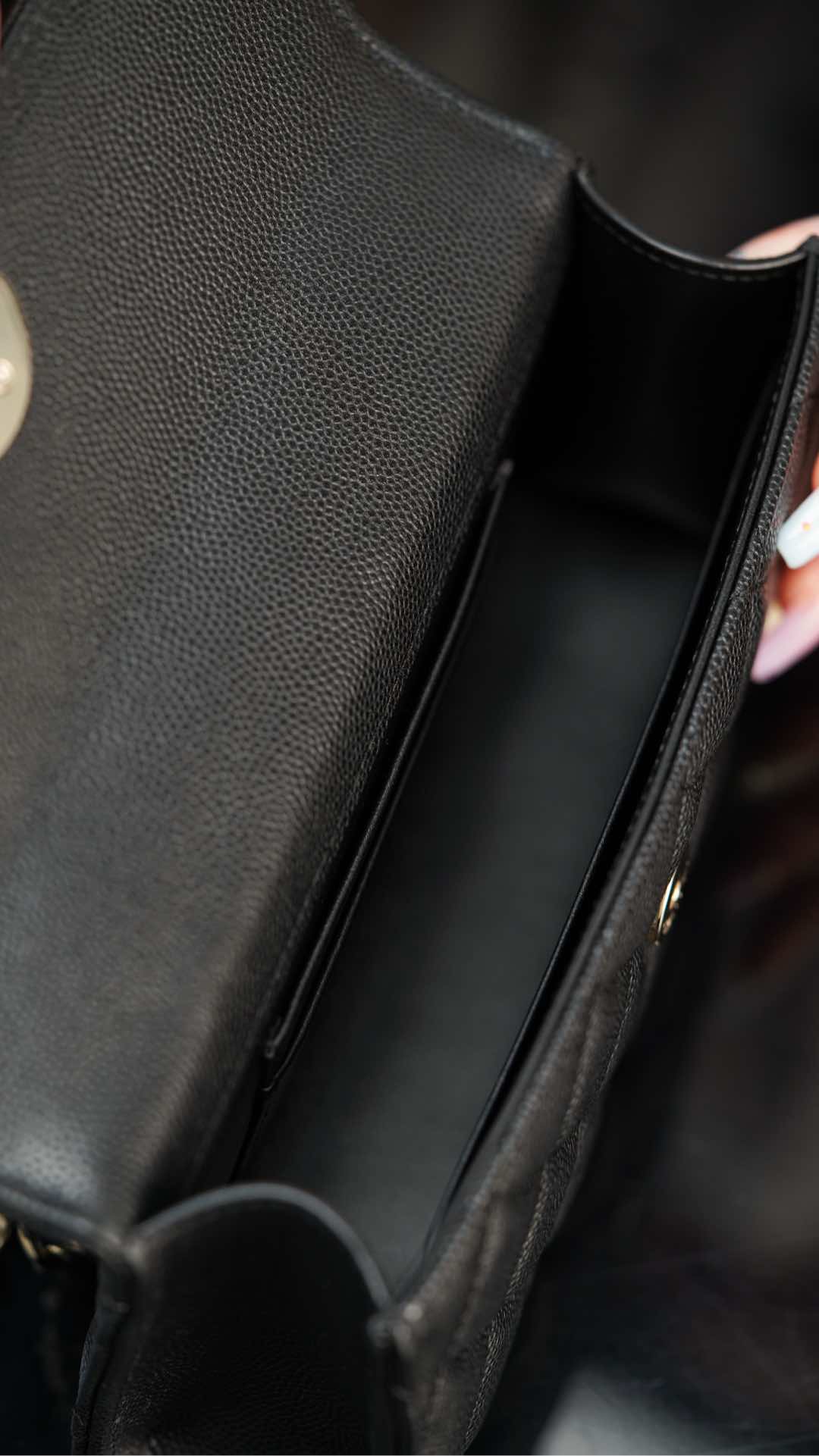 內裡同樣為全黑皮革設計,卡位與隔層的配置實用度極高,容量能輕鬆收納兩支手機與日常小物,是顏值與機能兼具的高級手提包。