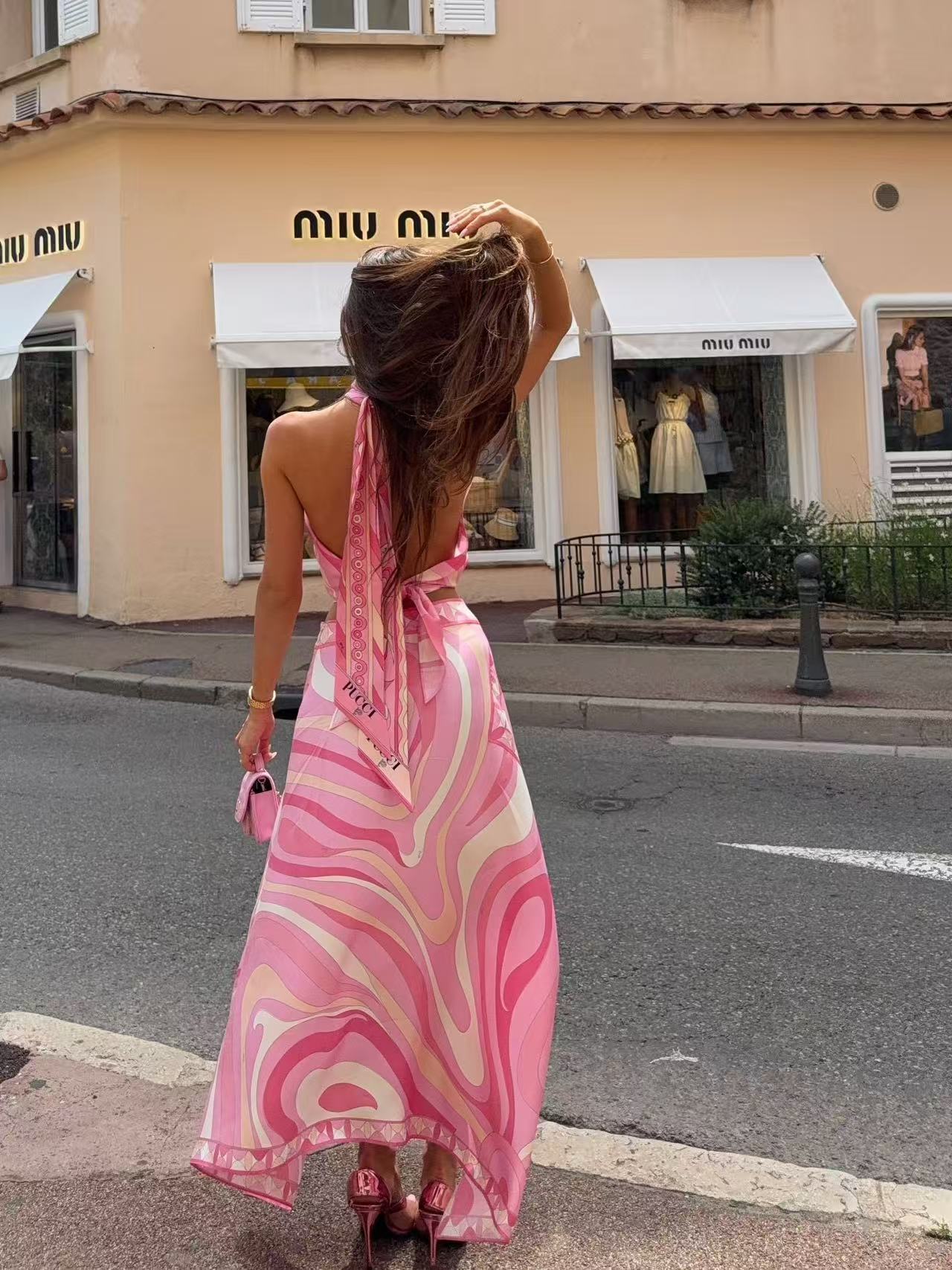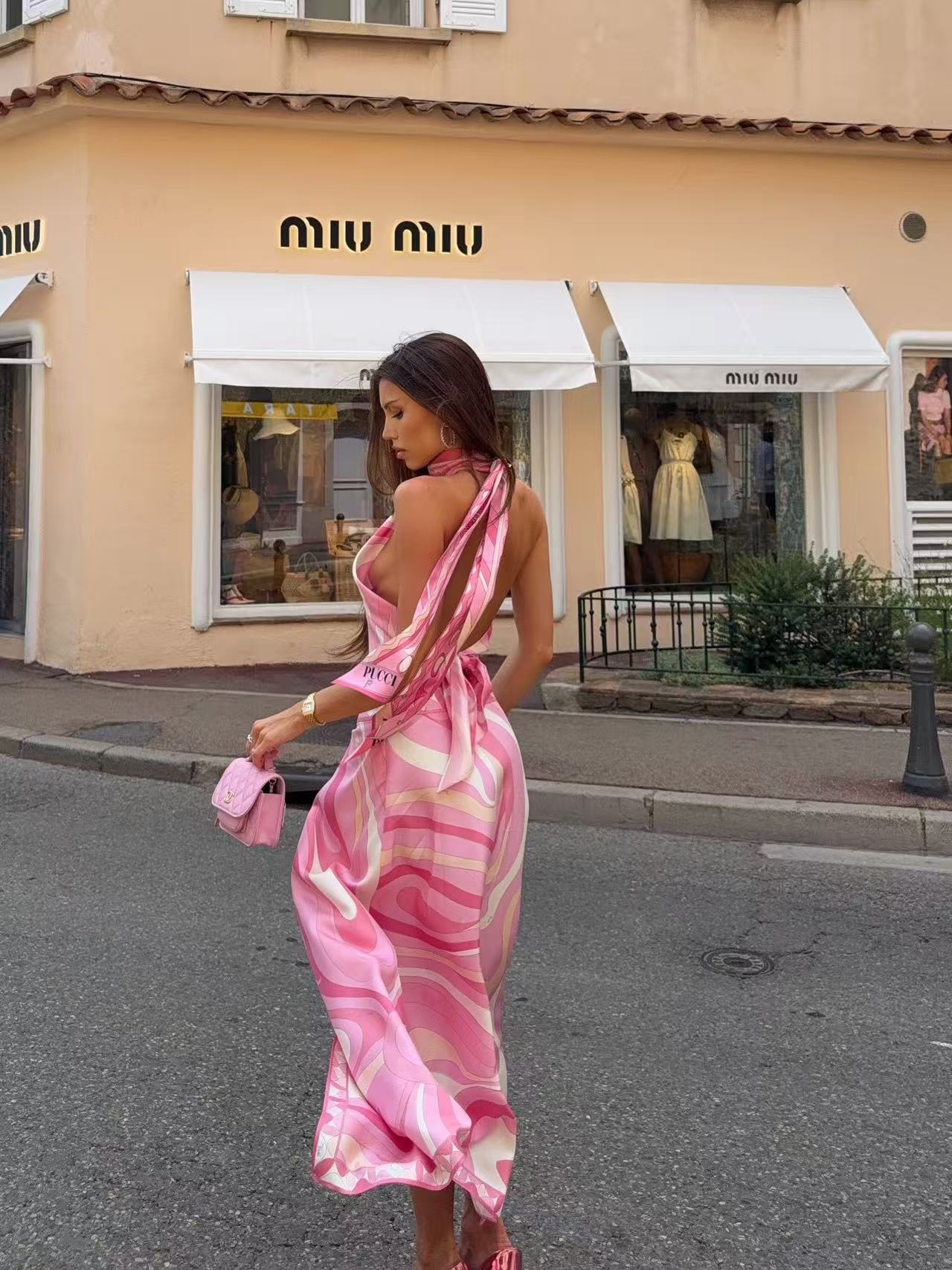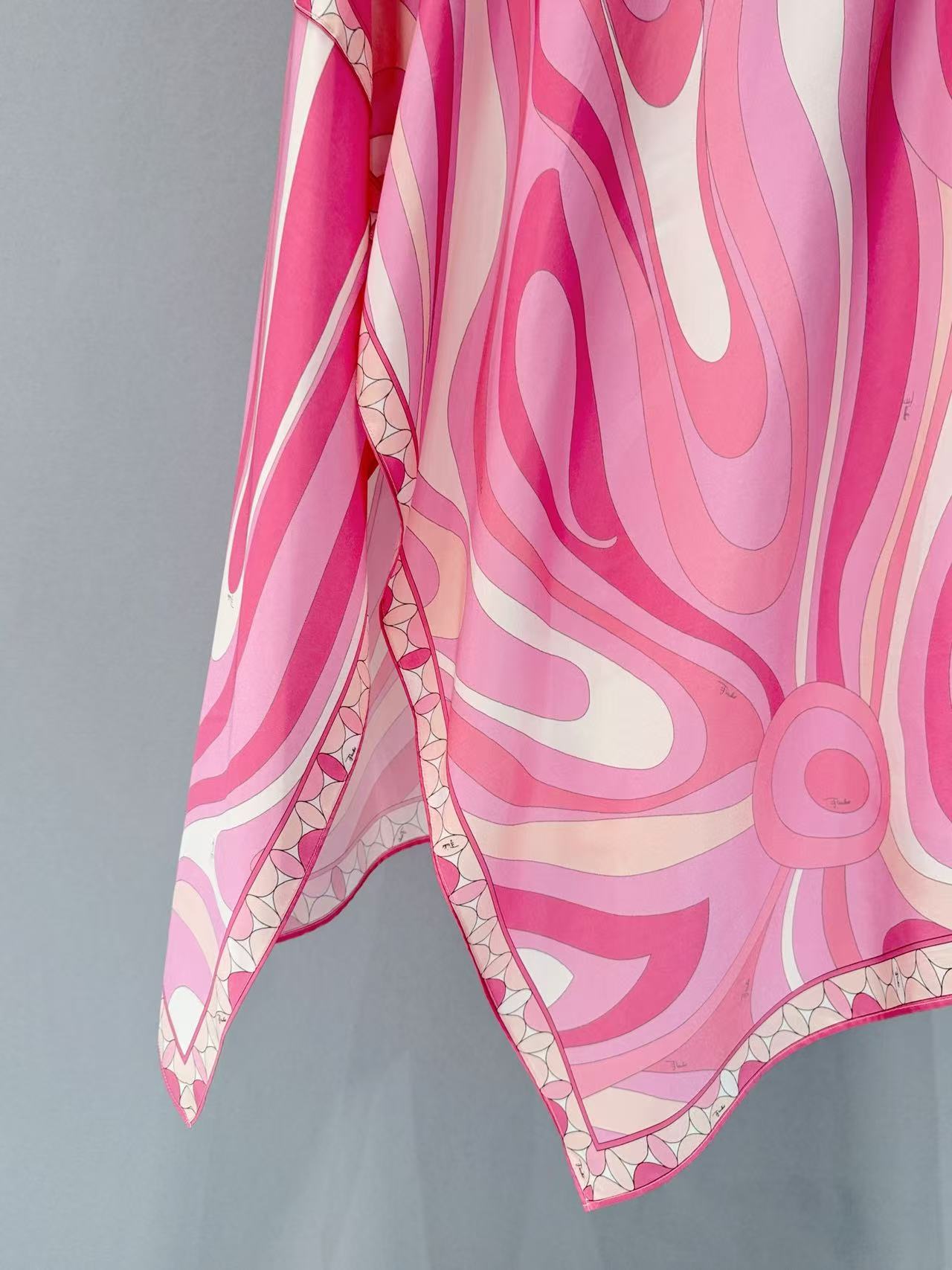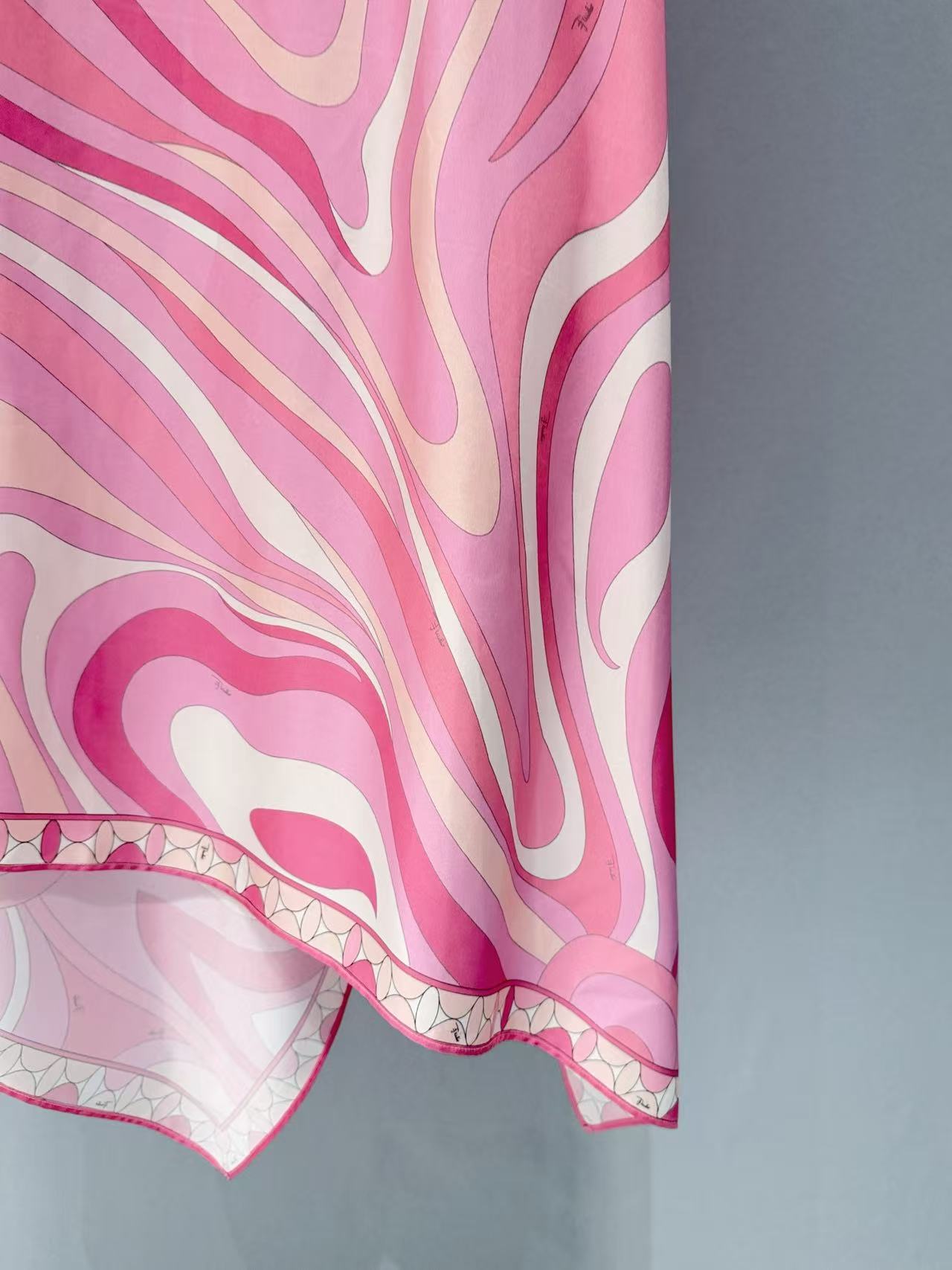 這種材質手感軟糯親膚且帶有天然涼感,比起普通薄真絲更顯奢華的光澤深度,且能完美撐起不對稱裙擺的立體輪廓。
