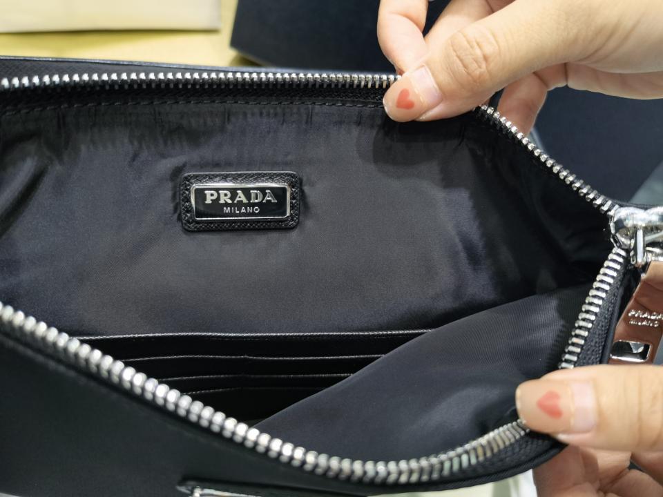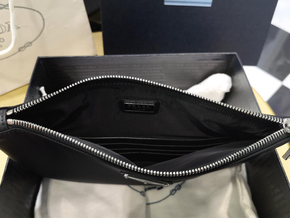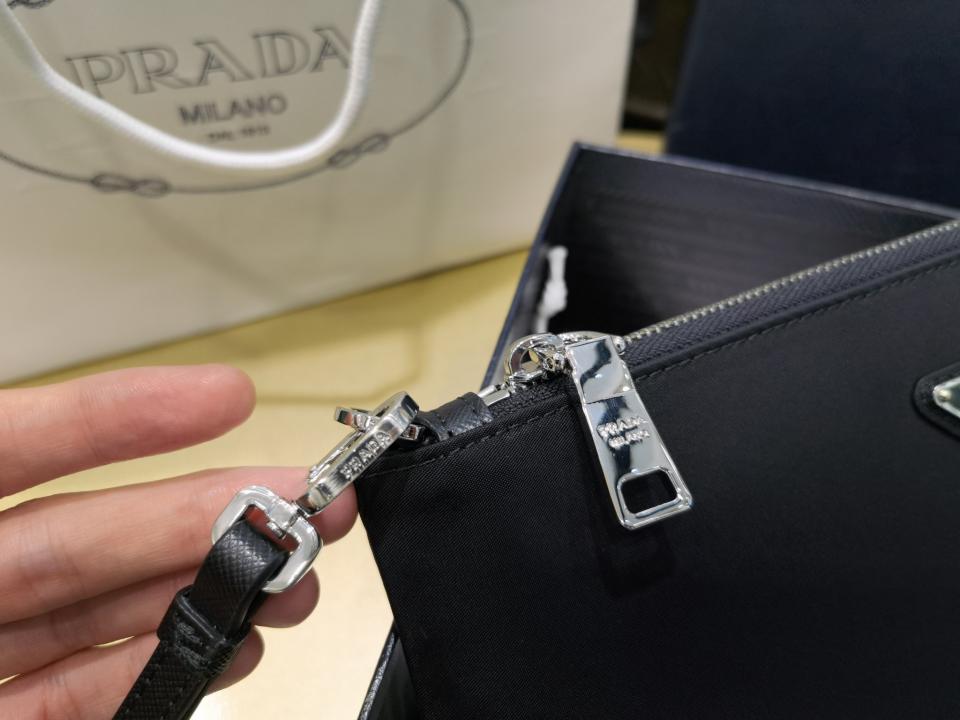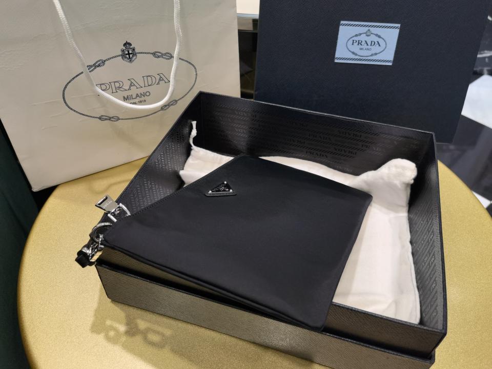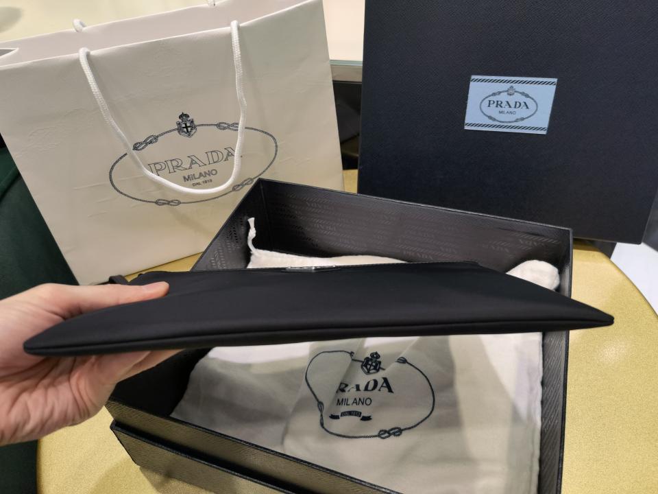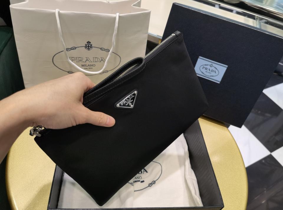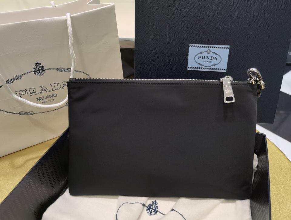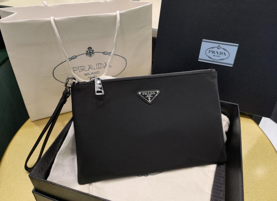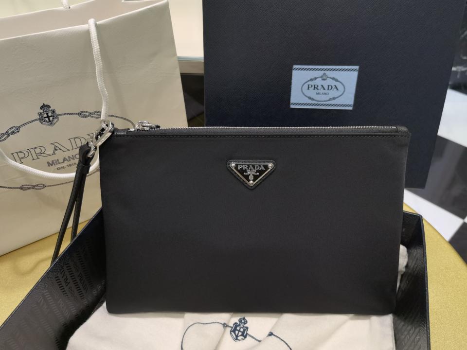 纖細超薄的設計和低調的細節處理使得這款手拿包更具特色。 P家標誌、拋光不鏽鋼五金配件和腕帶為這款包增添精妙美感,而內袋和卡槽則增強了它的實用性。 尼龍材質+十字紋牛皮,尼龍內裡,可拆卸皮革手腕帶