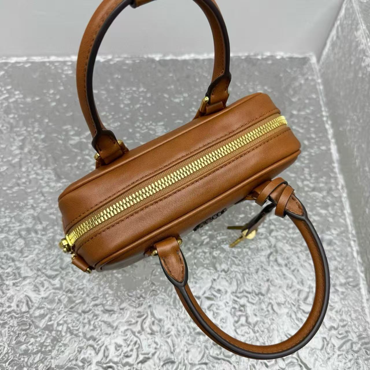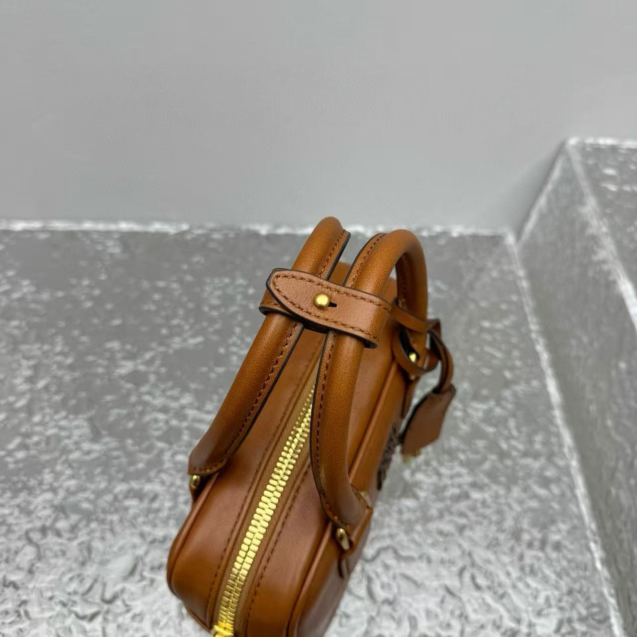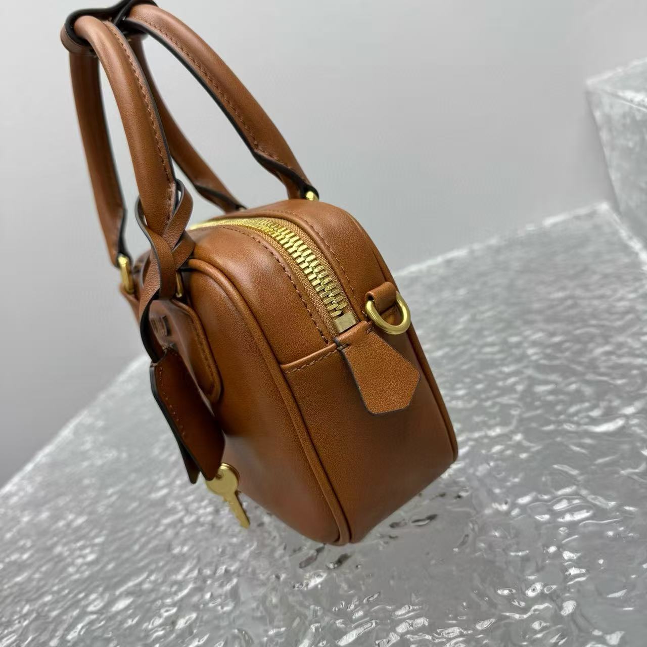 這款小方包採用焦糖色做舊皮革,質感細膩且帶有復古光澤,經過特殊處理的皮革既有挺括感又不失柔軟,